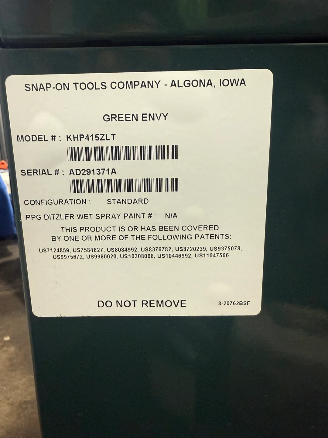 95Selling a Snap-On Tools tool storage unit in Green Envy. The model number is KHP415ZLT, and the configuration is standard. This unit has been well-maintained and is ready for a new workshop!