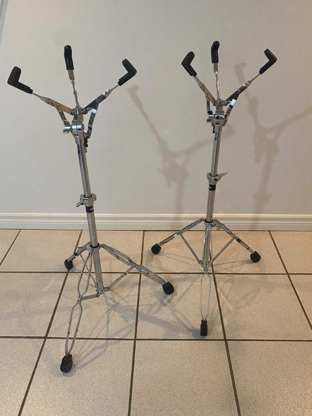 29Selling two Gibraltar 5606 extended height drum stands in excellent condition. They have a chrome finish and are fully adjustable. Professional-grade, double-braced stand designed to hold drums from 10" to 15" in diameter. Key features include an extended height range from approximately 26" to 40", a gearless basket tilter for flexible angle adjustment, and a hinged height adjustment system. It uses double-braced legs with round rubber feet for stability. The carrying bag in the picture is included.