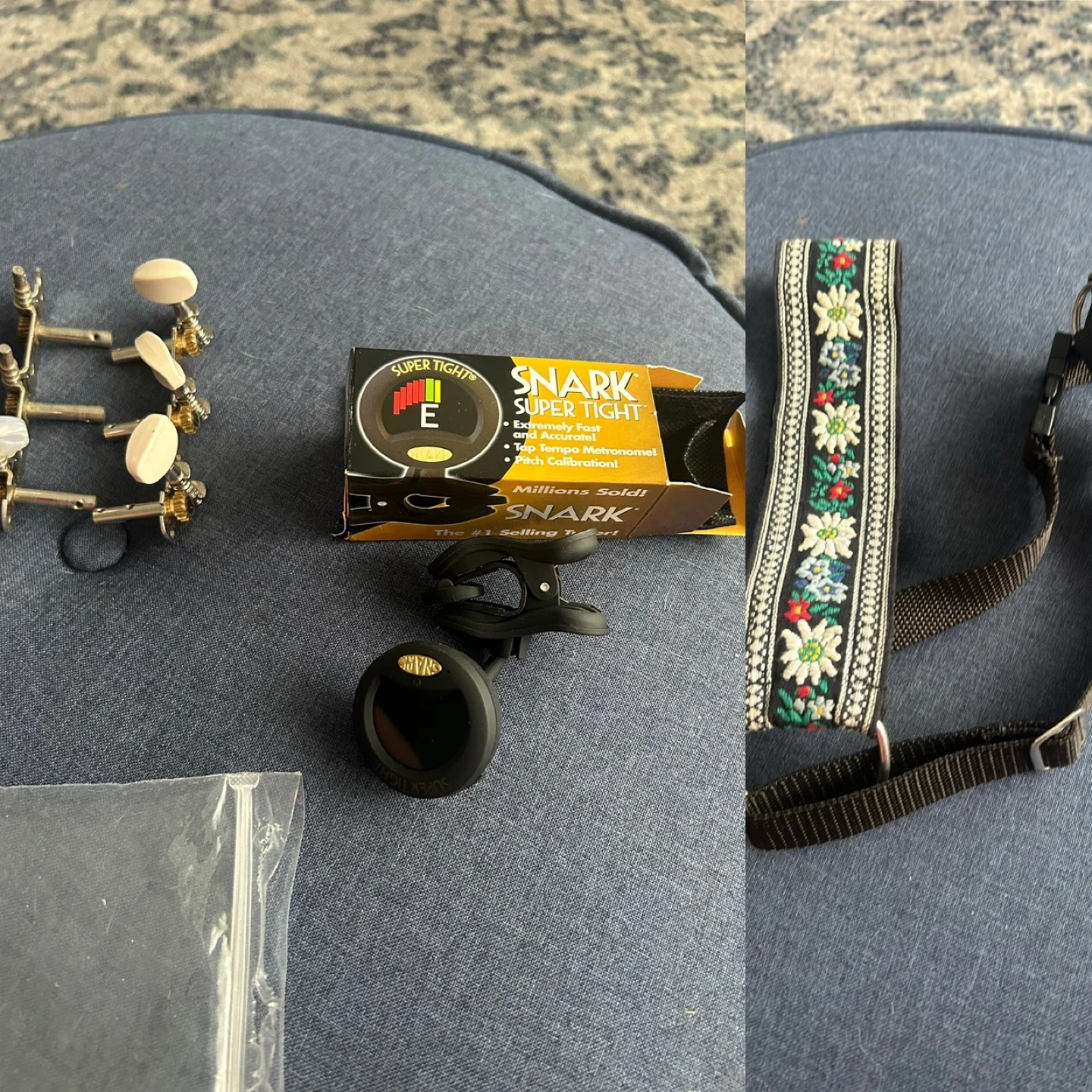 Selling a Snark Super Tight guitar tuner. It's extremely fast and accurate with a tap tempo metronome and pitch calibration. Also included are tuning pegs, as pictured. Floral guitar strap