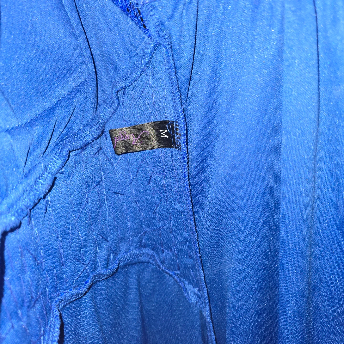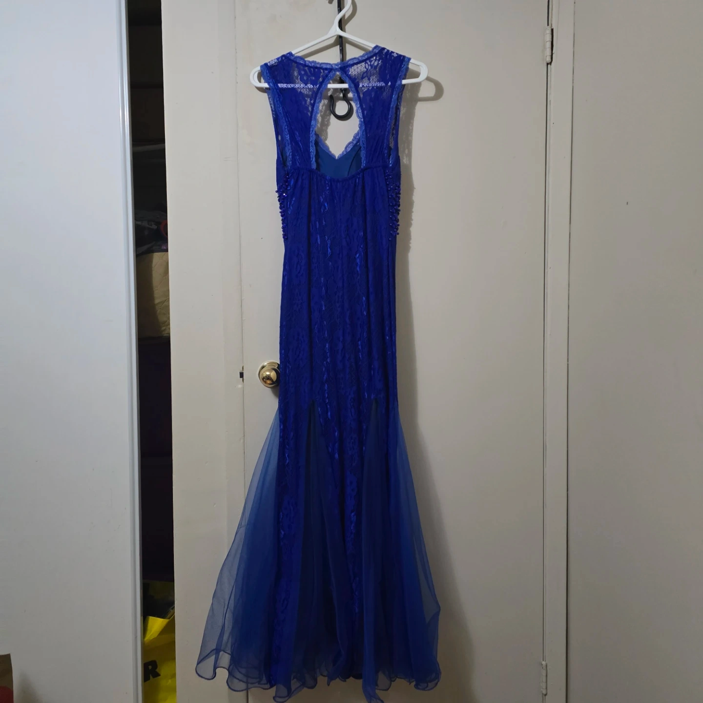 This royal blue evening gown features intricate lace detailing throughout. It has a V-neckline with beaded embellishments at the waist and a flowing tulle skirt and a keyhole style back. The side zipper works very well and the dress itself is very comfortable. Size Medium.