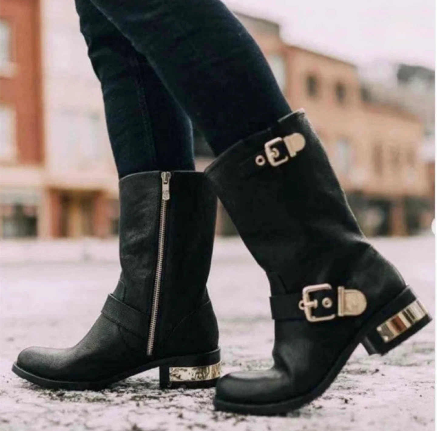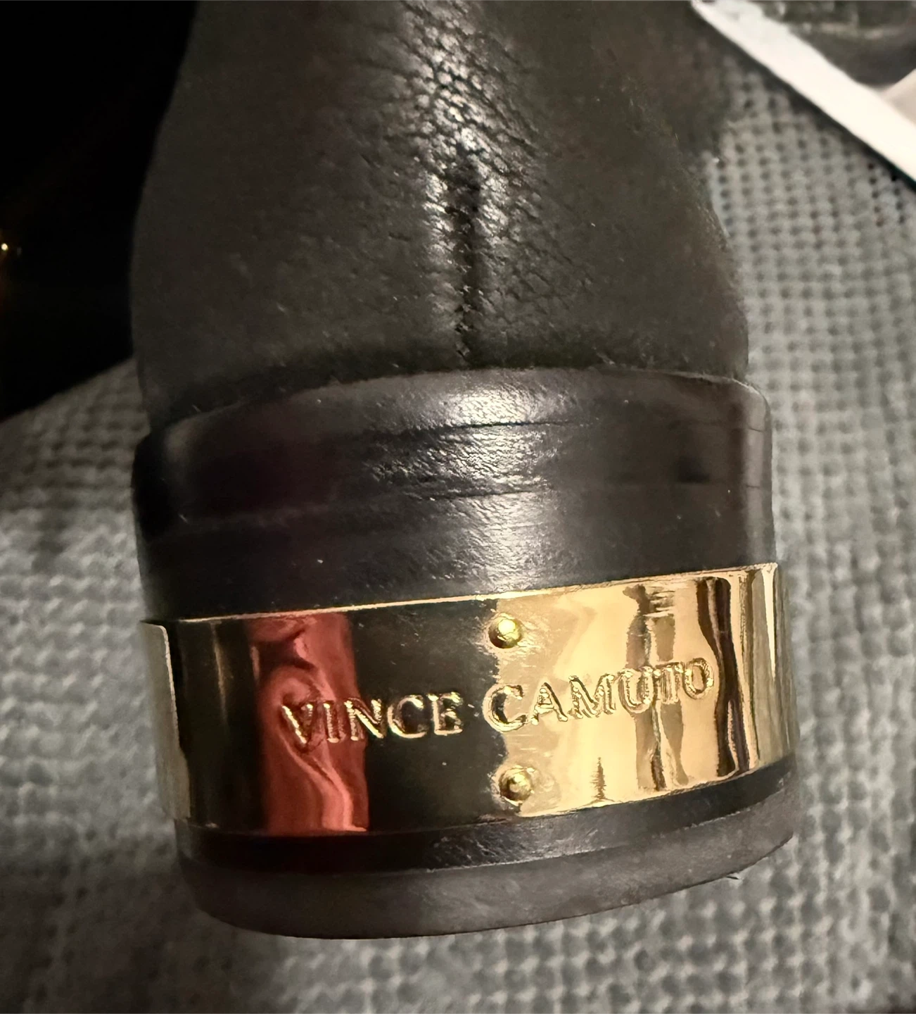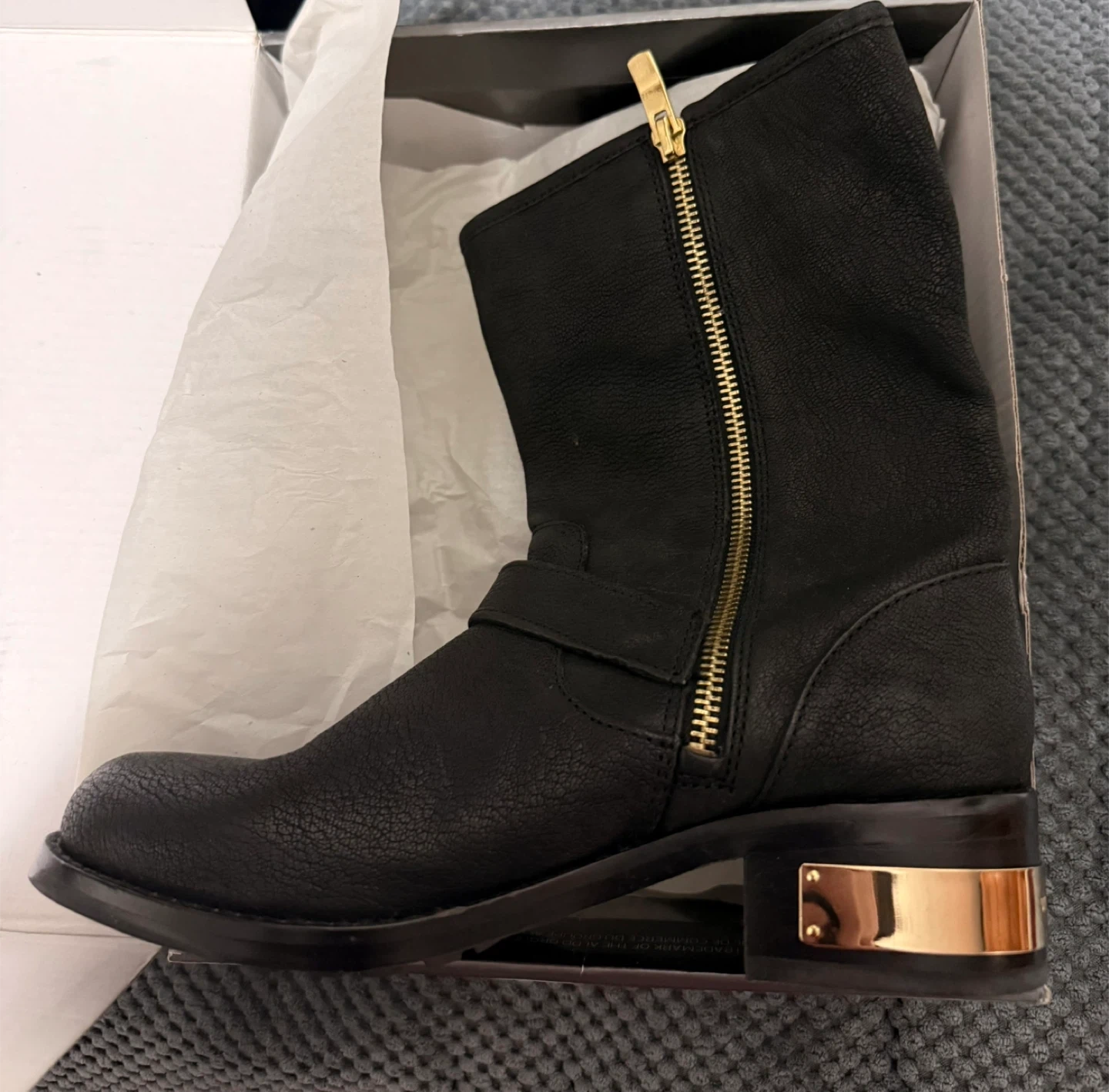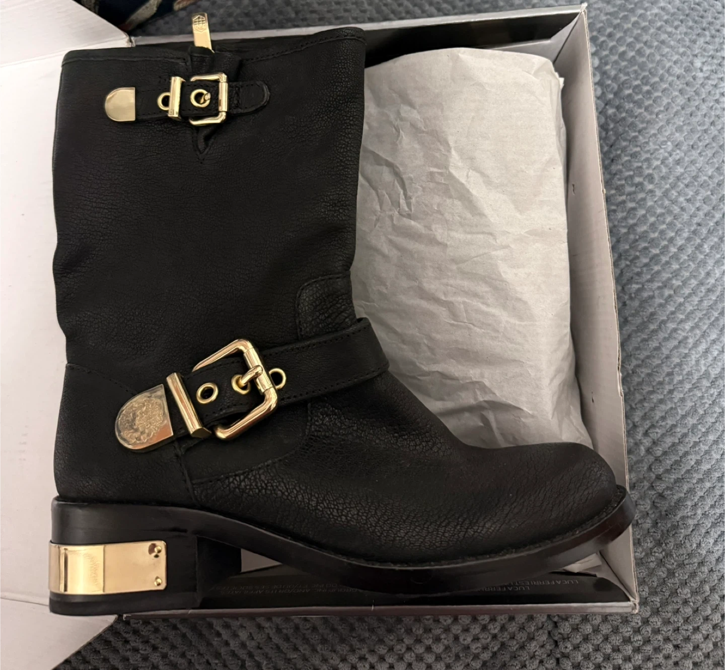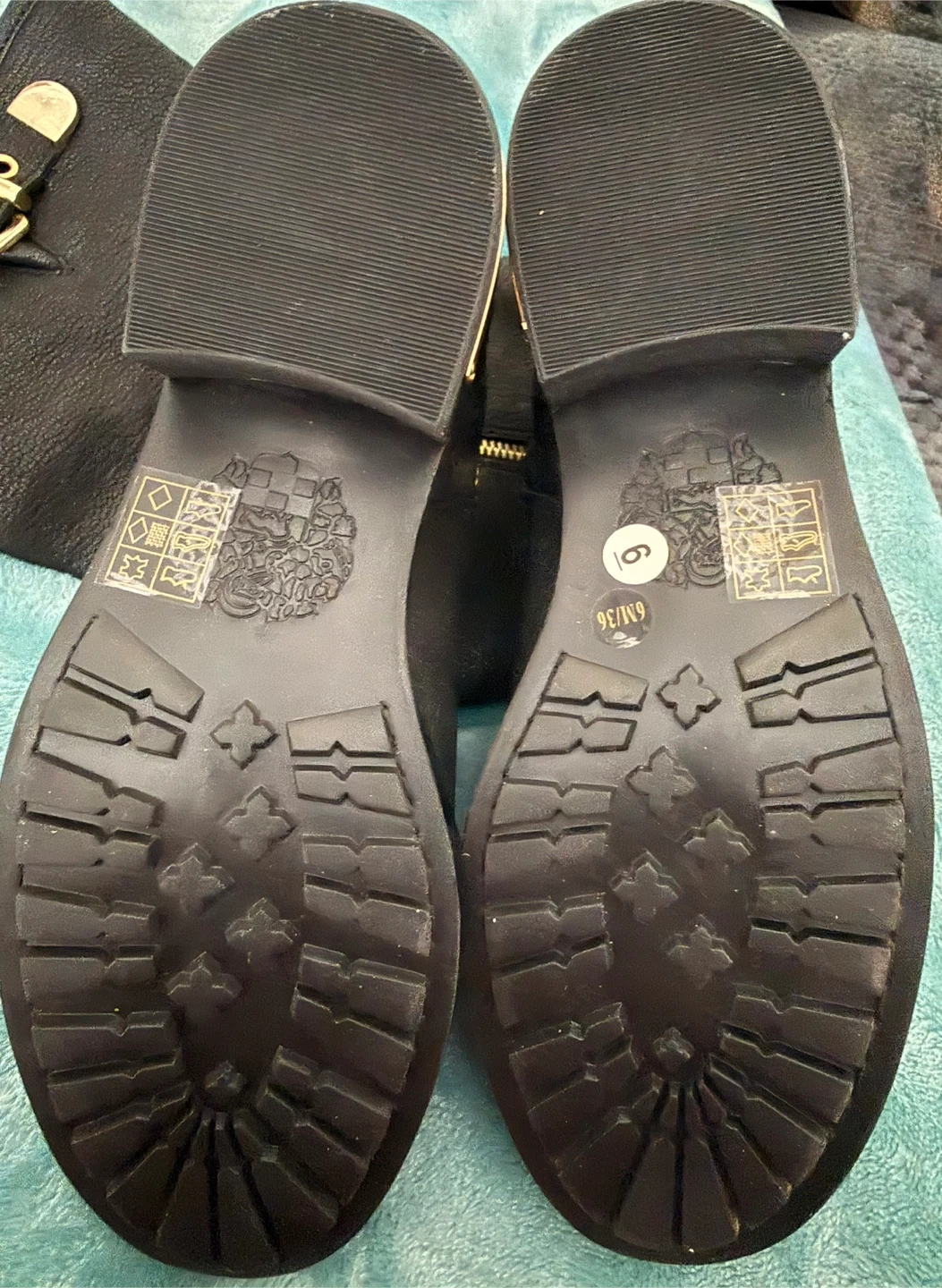 These Vince Camuto boots are made from black leather. They feature gold-tone buckles, zippers, details and a block heel.