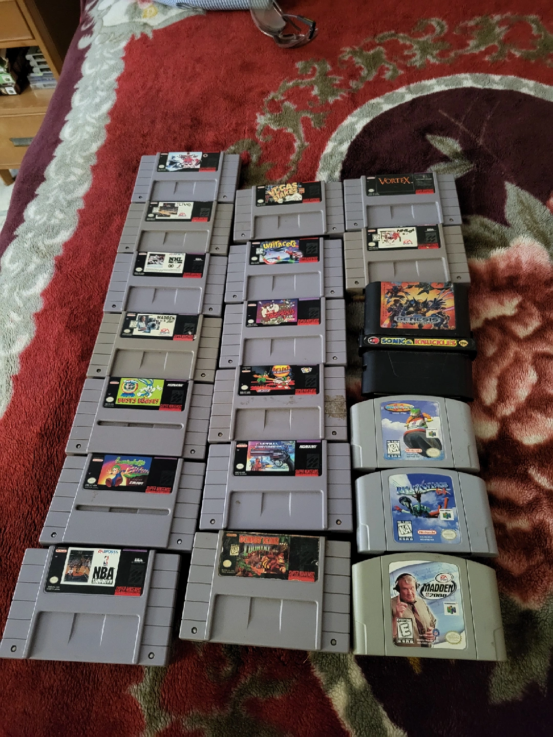 Selling a bundle of SNES and N64 game cartridges. Includes titles like Donkey Kong, Madden, NBA Showdown, Vortex, and more! Great for retro gaming enthusiasts