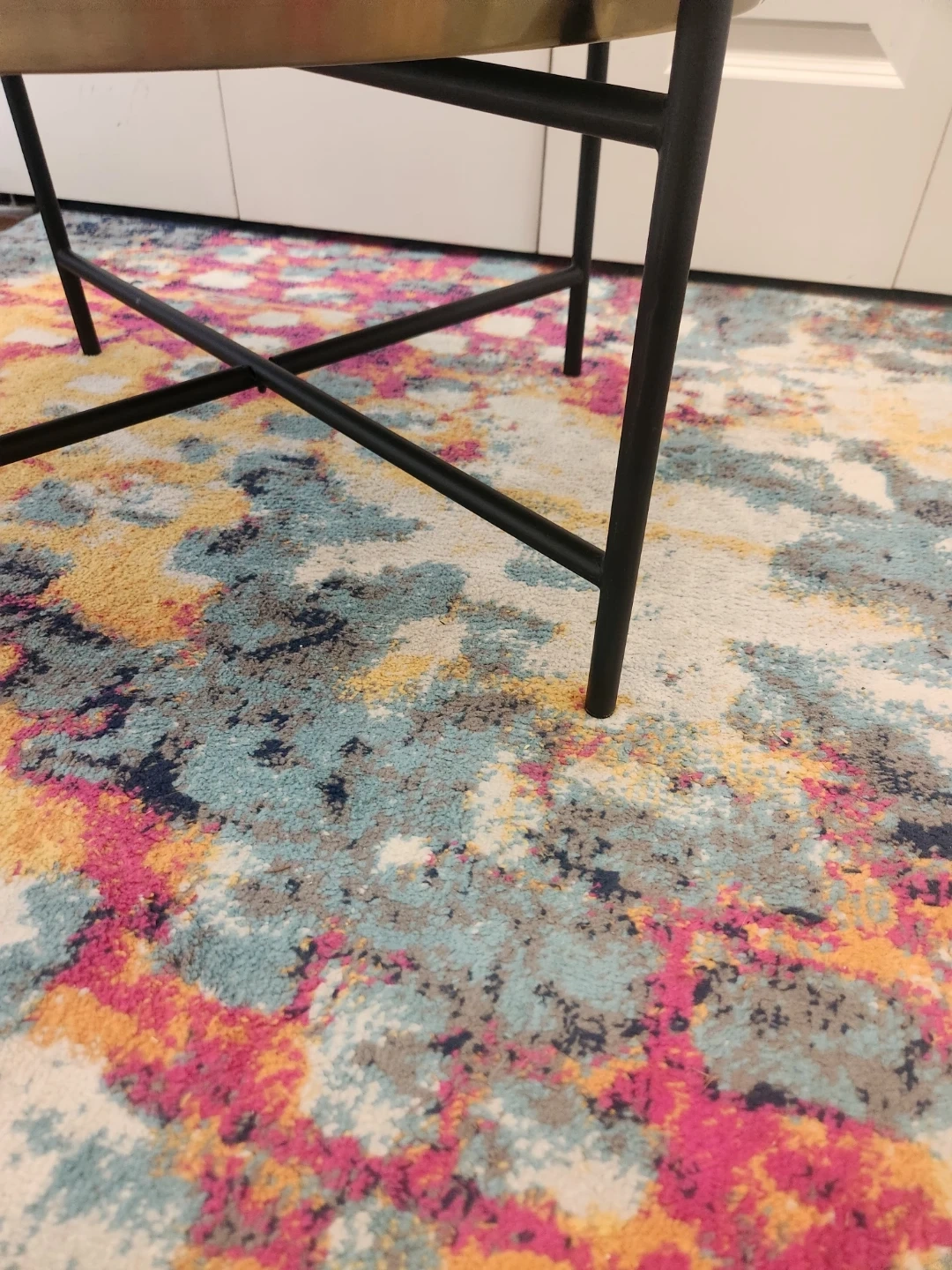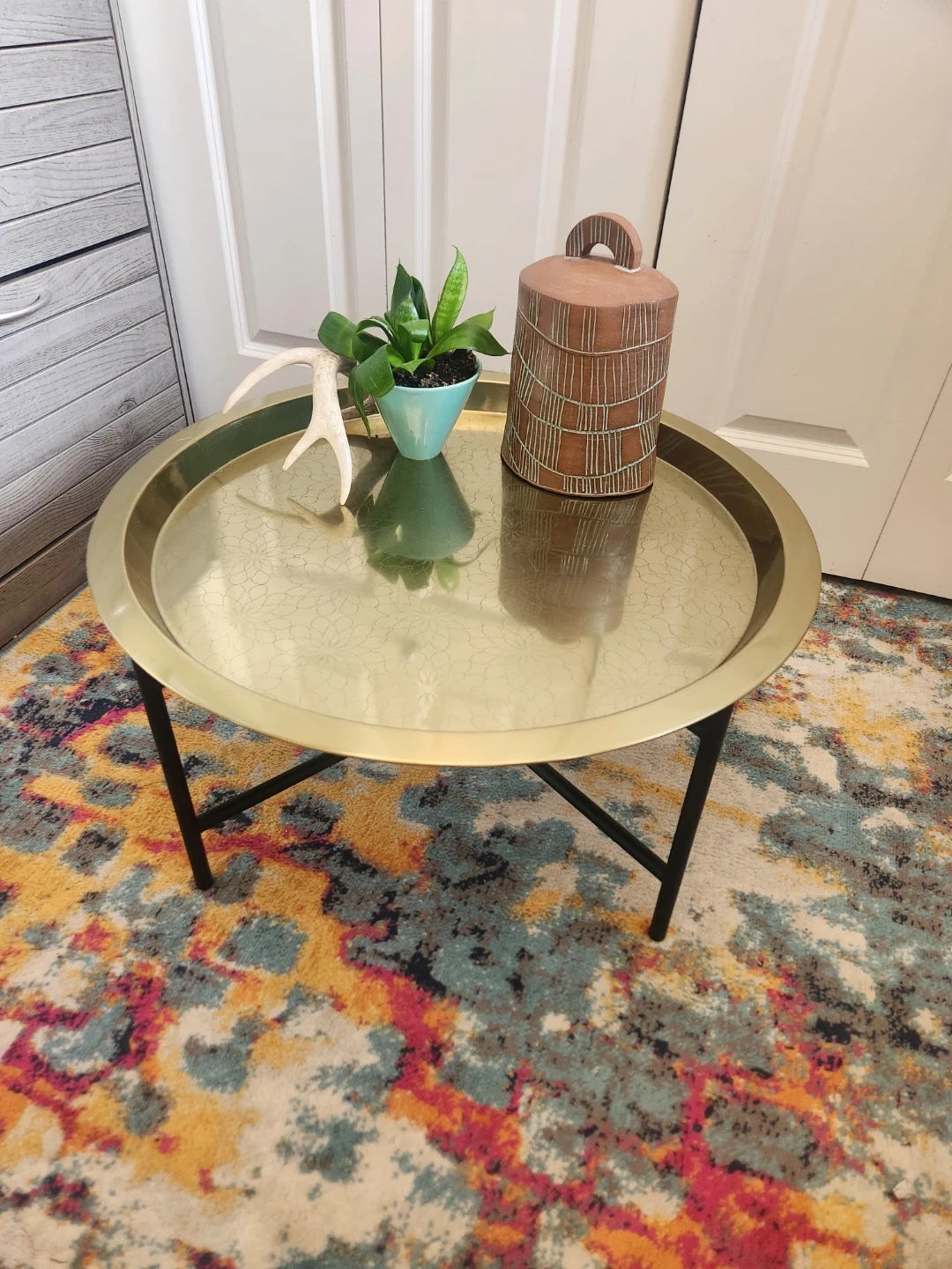 This LIKE NEW round IKEA coffee table features a gold-tone REMOVABLE tray top with an embossed floral-like pattern. It's supported by black metal legs with an X-brace design. It's a stylish accent piece for your living room!