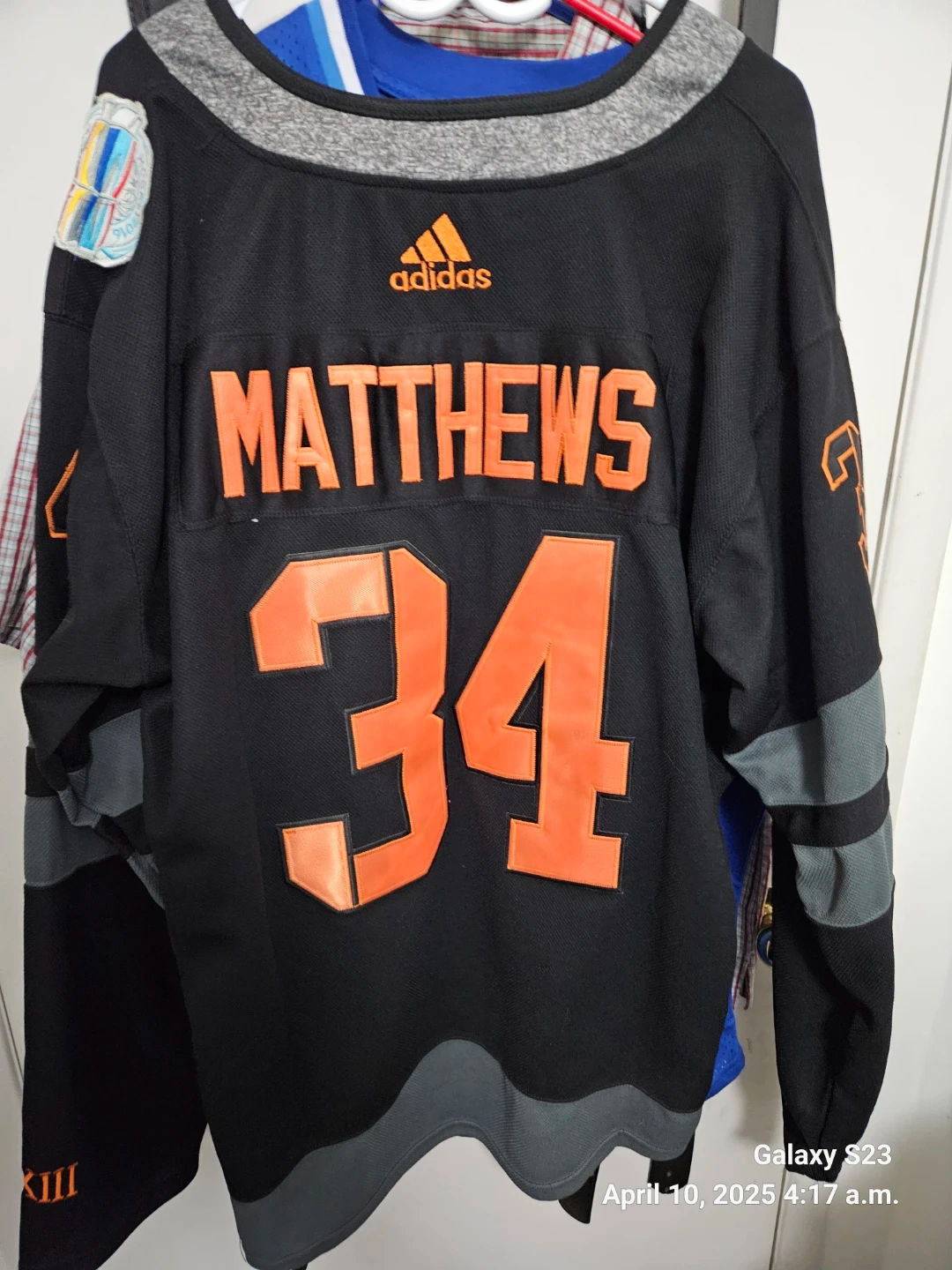 This is an Adidas hockey jersey for Auston Matthews, number 34, of the Toronto Maple Leafs. It's a black jersey with orange and grey accents. Made by Adidas.