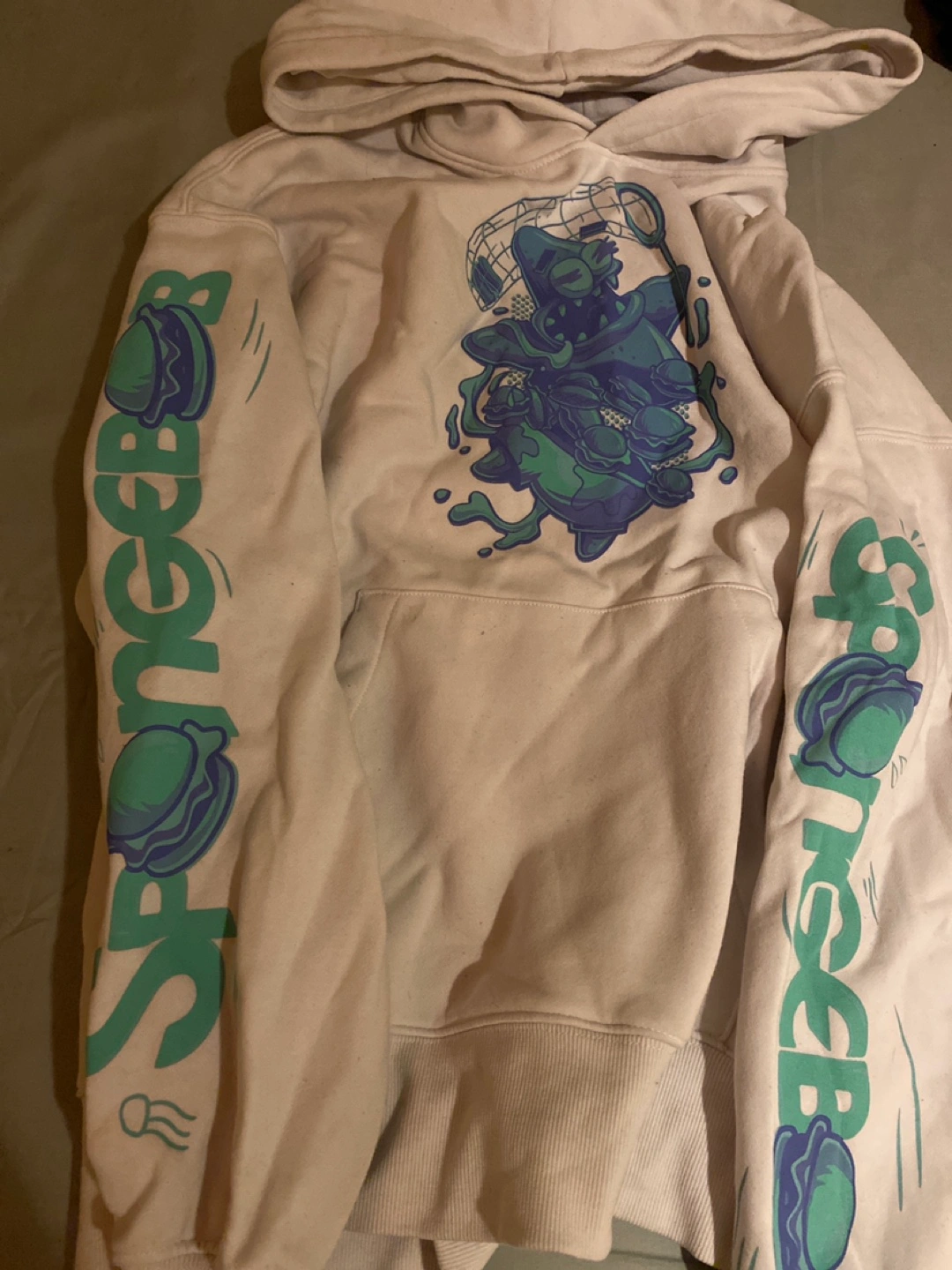 Cozy Spongebob hoodie with a fun design! It features Patrick Star with a net and Spongebob text on the sleeves. Perfect for any fan of the show