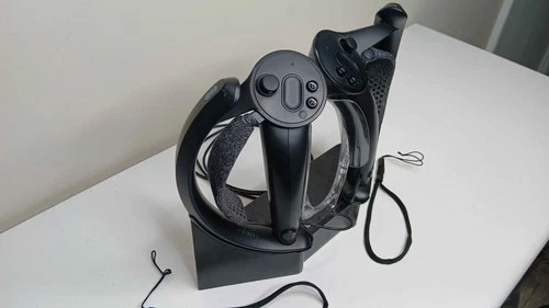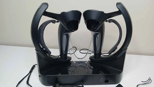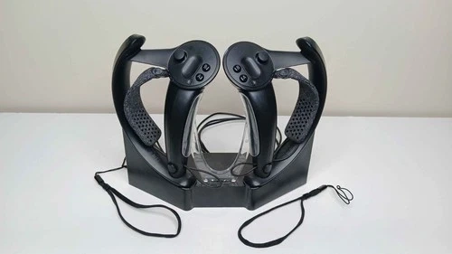 For sale is a genuine Valve Index controller set, including both left and right controllers along with an AMVR charging dock and wall/table mount. The controllers have some cosmetic scuffs but buttons, thumbsticks, and tracking sensors are intact with no drift. Charging ports are clean and functional. This is a great replacement or upgrade set for an existing Valve Index setup.