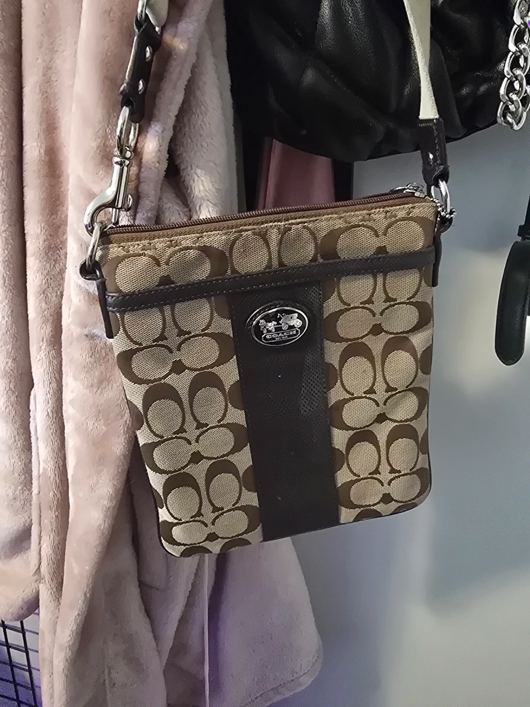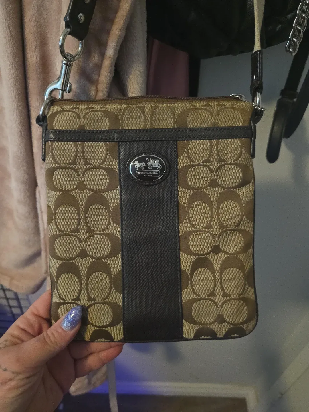 This is a cute Coach crossbody bag in good condition! It's perfect for carrying your essentials while keeping your hands free. The classic Coach pattern adds a touch of style to any outfit