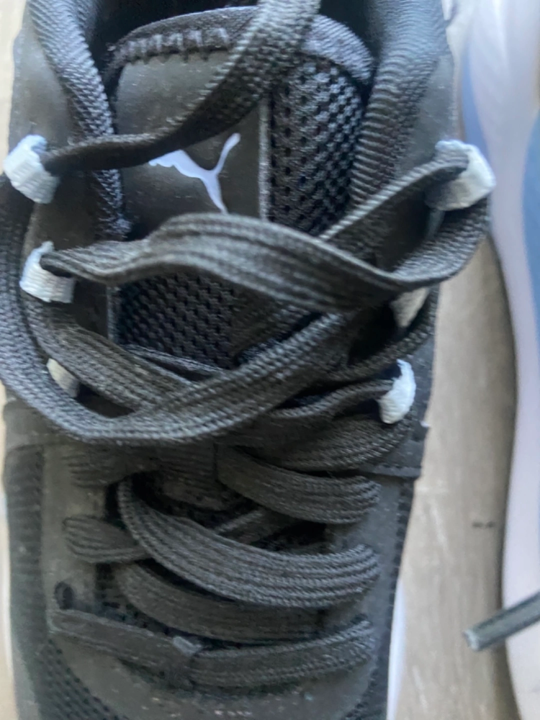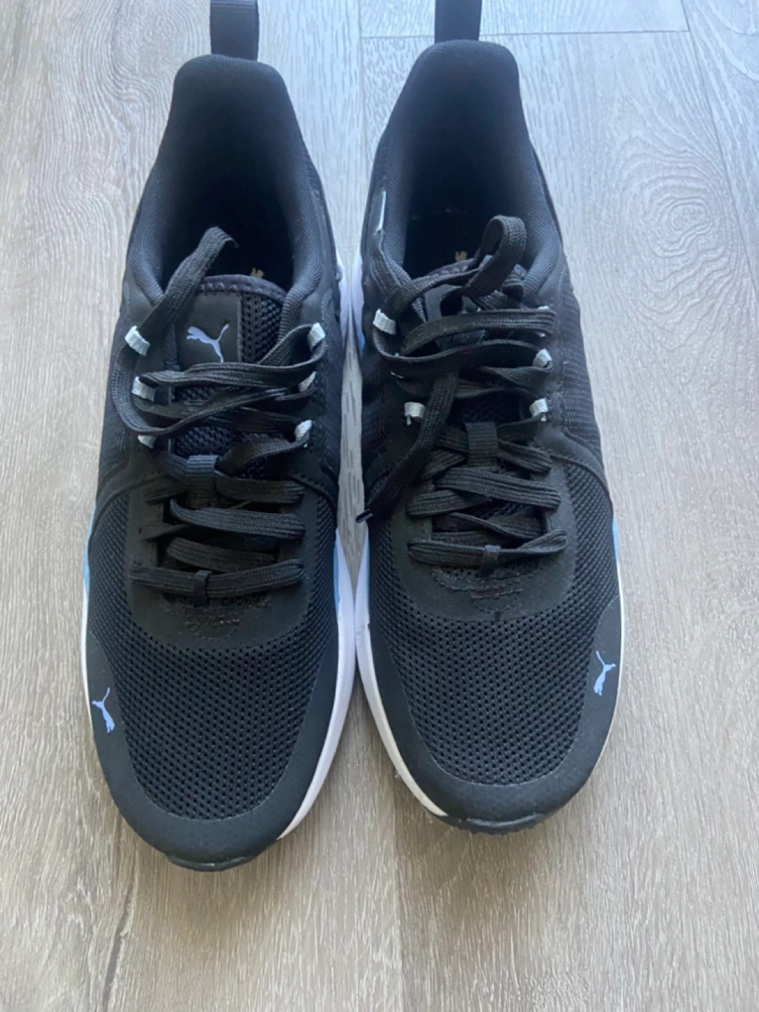 Women's Puma running shoes. Black with light blue accents. Lace-up closure. Breathable mesh upper. Comfortable and stylish.