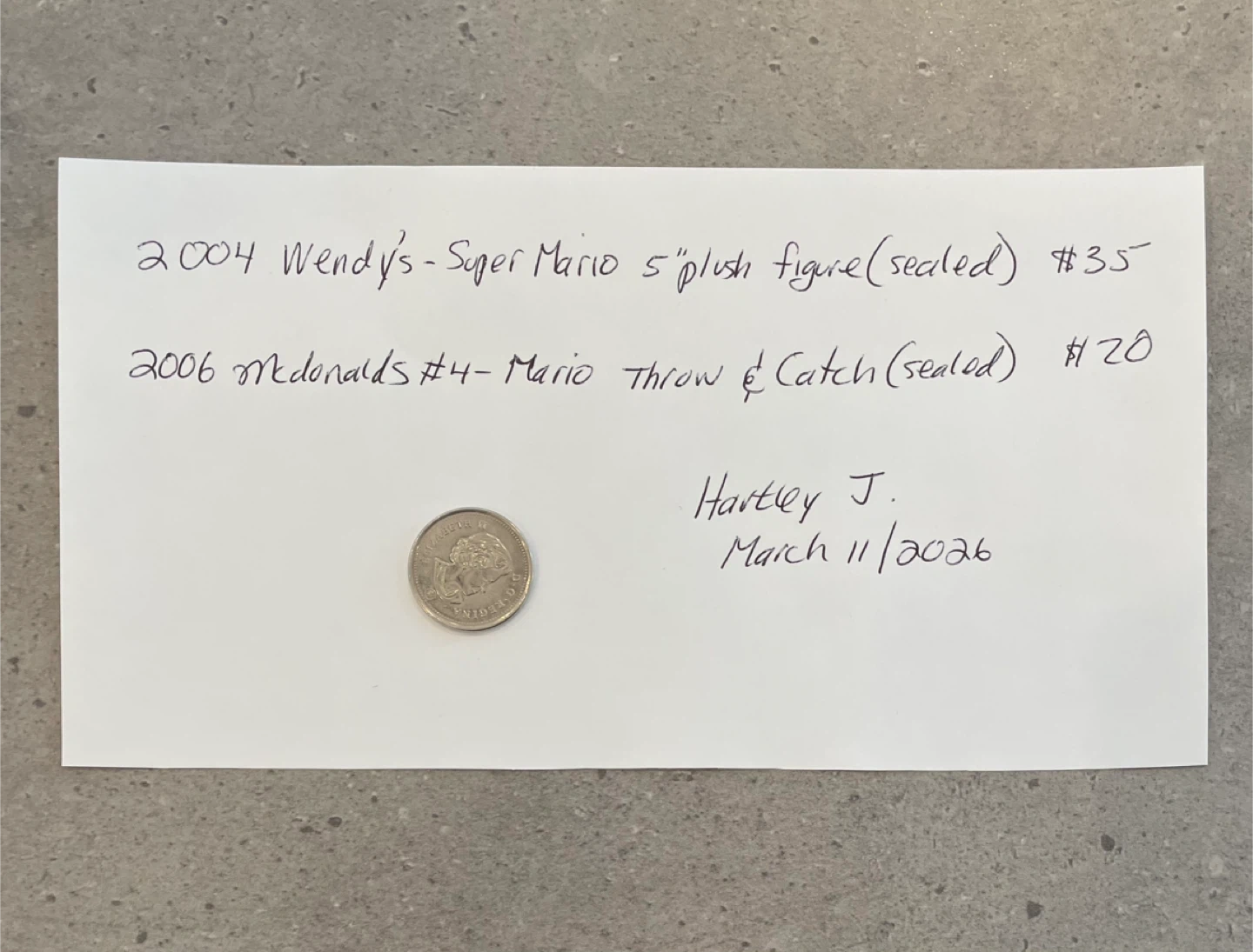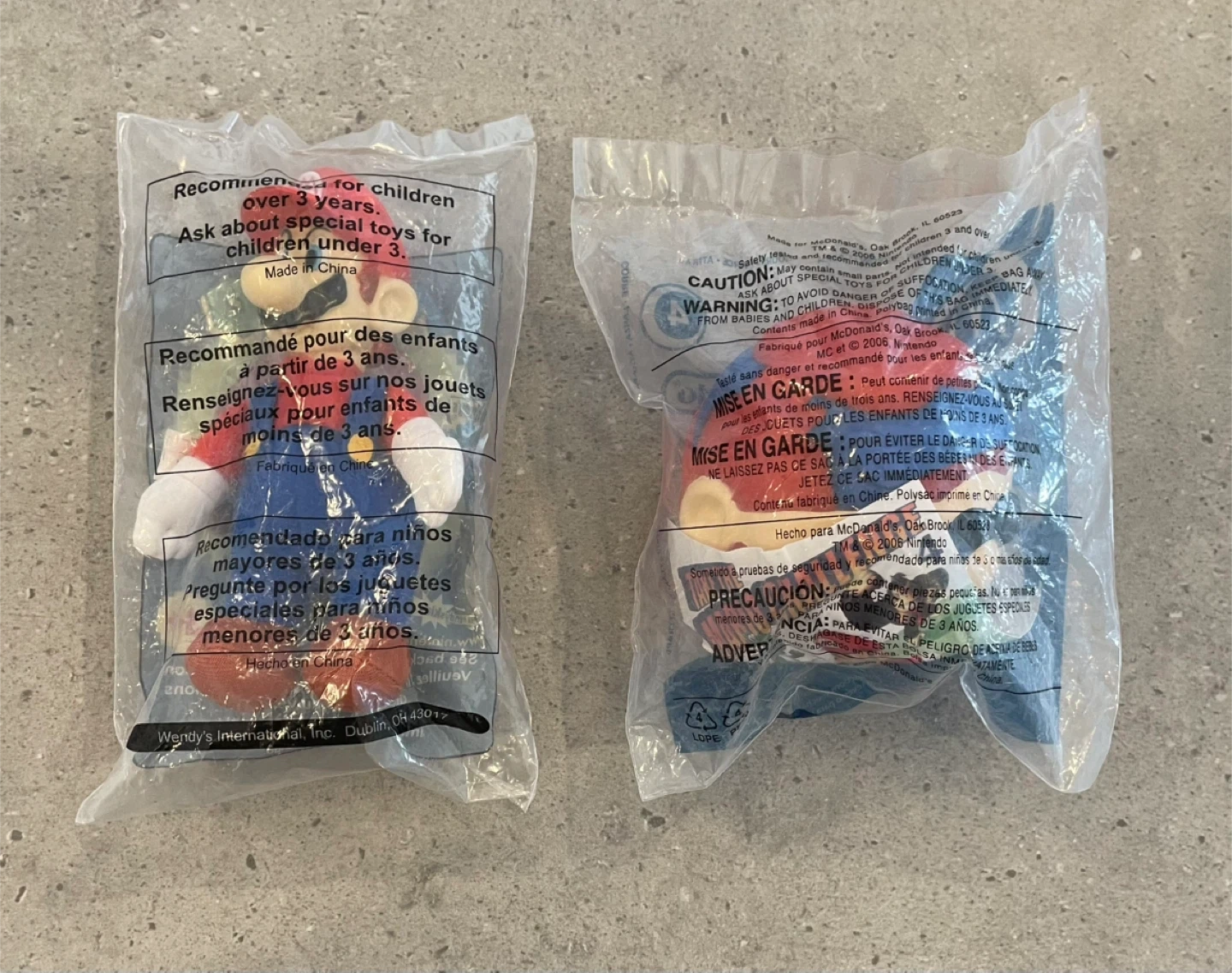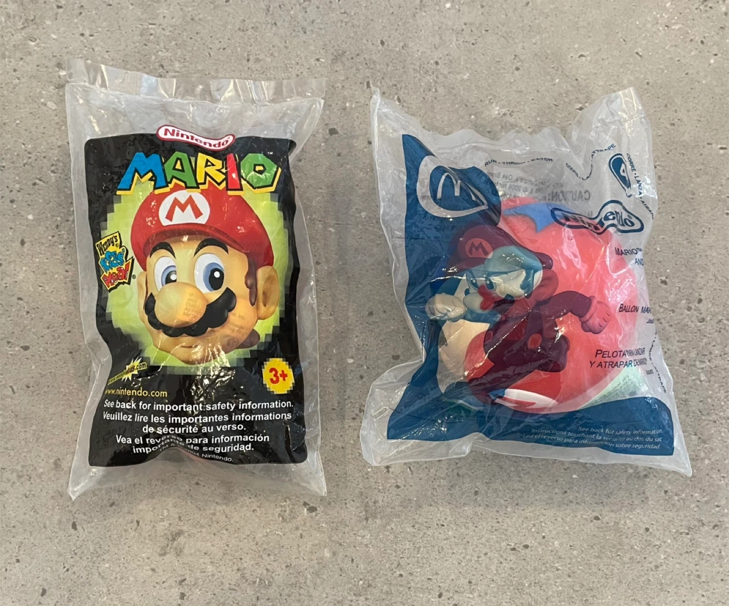 Two sealed Nintendo Super Mario toys from fast-food promotions. Includes a 2004 Wendy's plush figure and a 2006 McDonald's Throw & Catch game. Both are unopened in their original packaging.