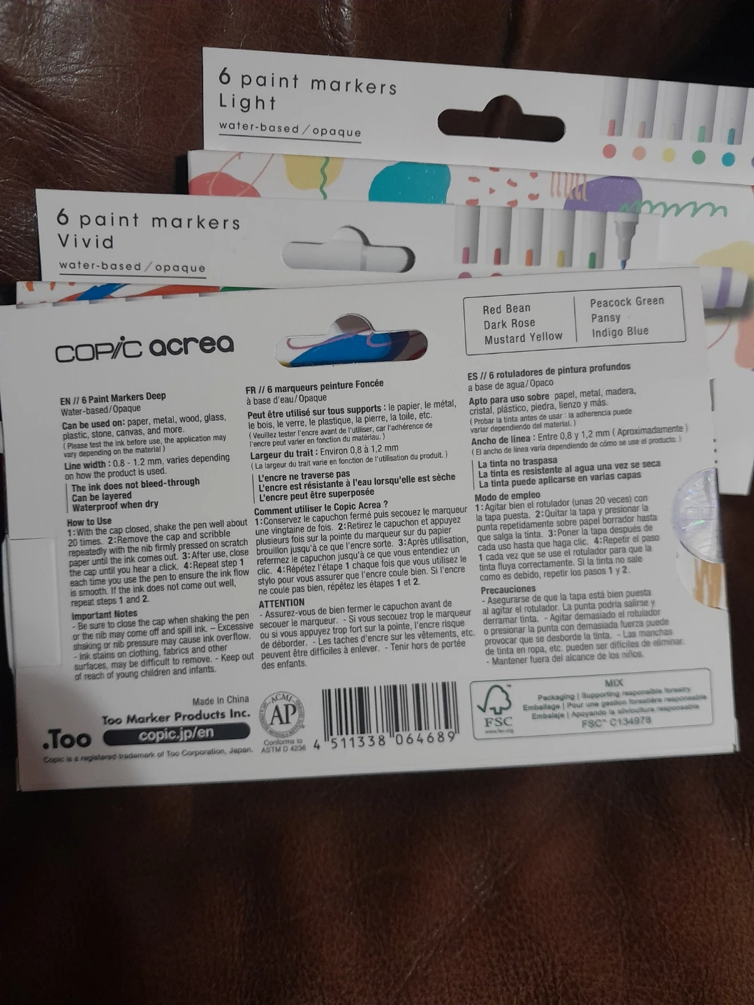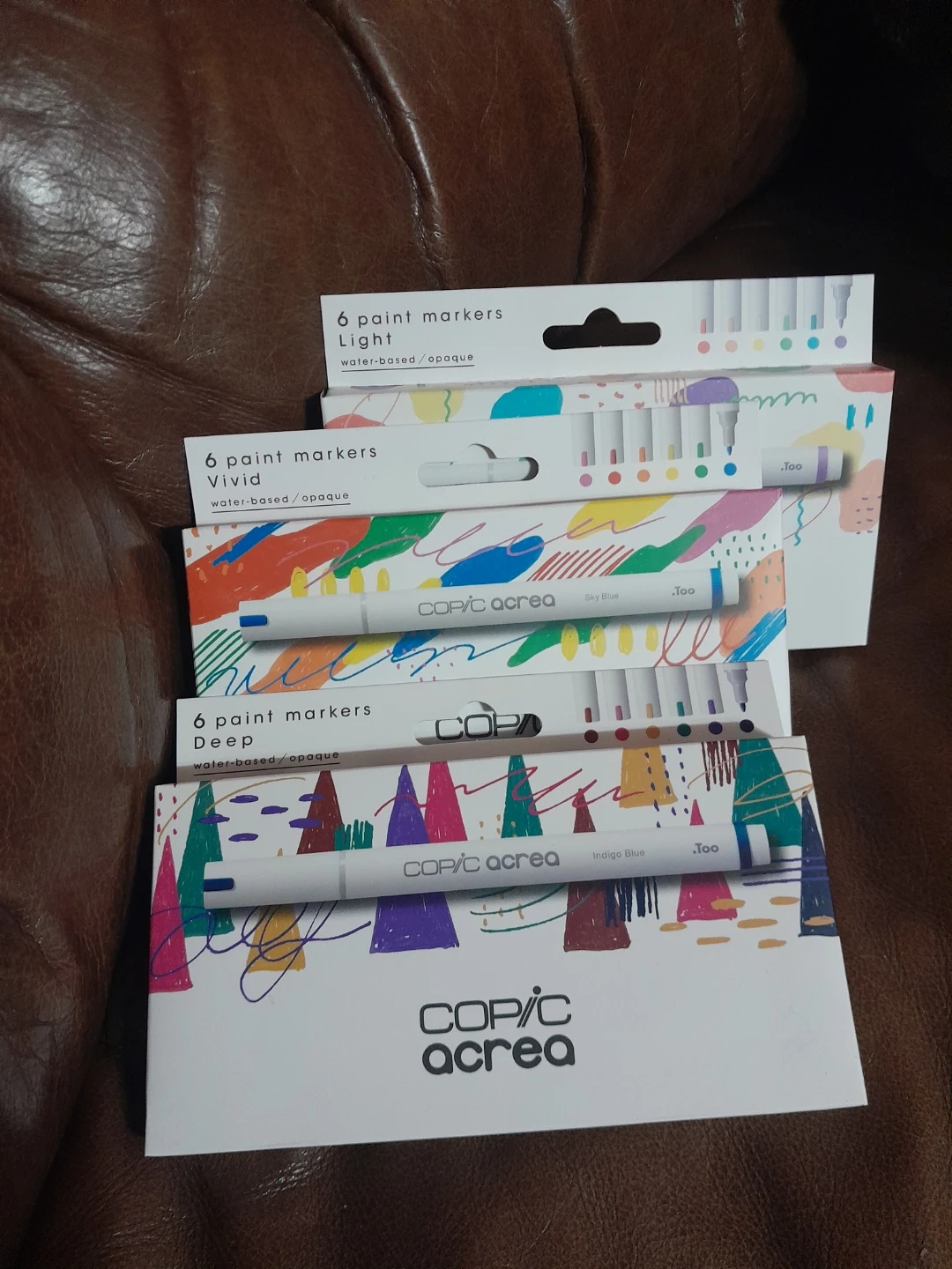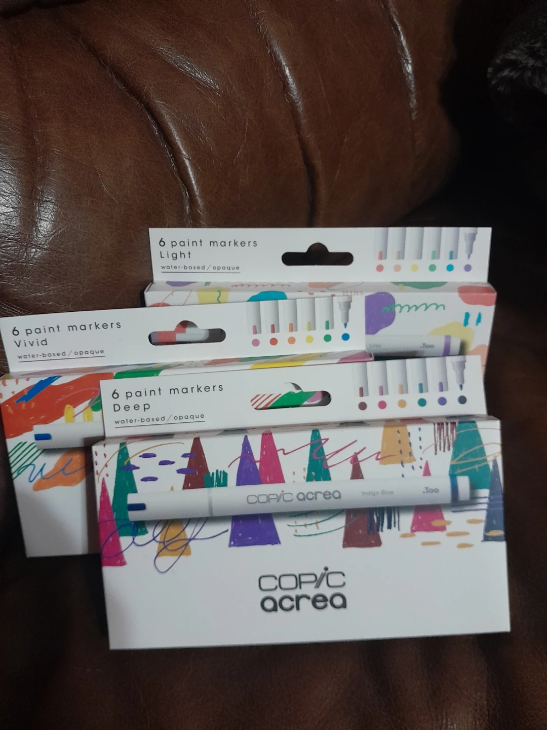 Set of six Copic A C R E A water-based opaque paint markers. Available in Light, Vivid, and Deep collections. Includes 6 colors per set. Made for detailed artwork and various surfaces. These markers are perfect for artists of all levels looking for vibrant, opaque color coverage. Brand new sealed box $15.00 each your choice