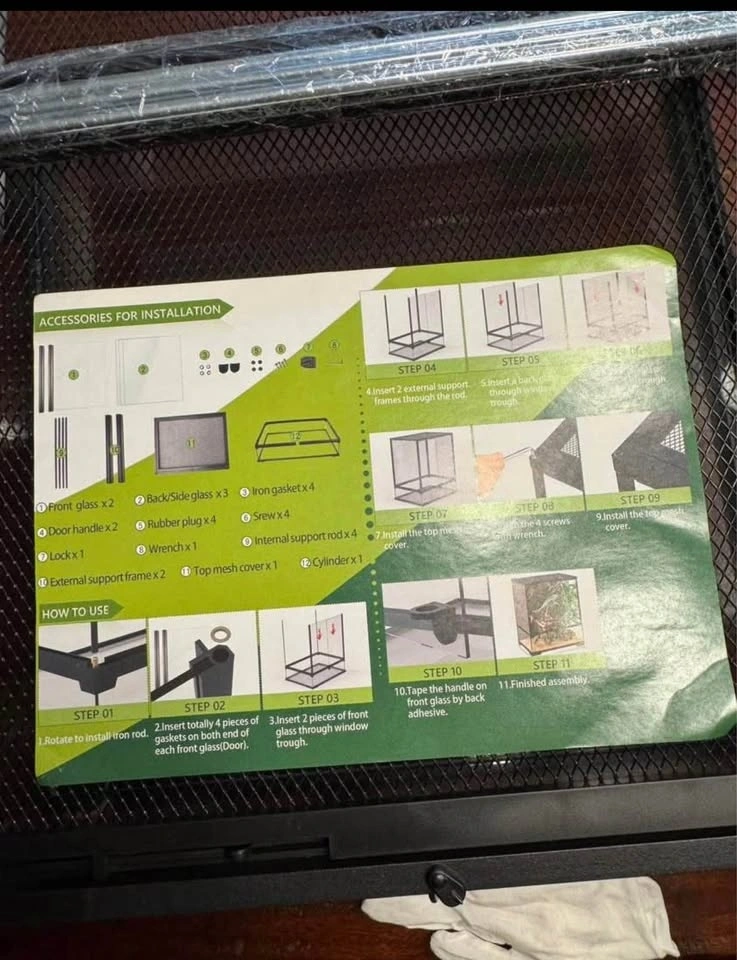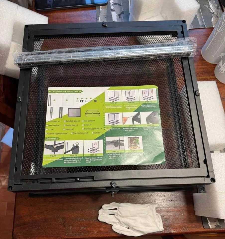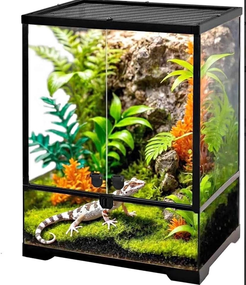 The NEPTONION 32-gallon (18"x18"x24" H) glass terrarium is a durable, front-opening habitat featuring high-quality tempered glass, a secure knob lock, and a waterproof base. Designed for reptiles, amphibians, and invertebrates, it includes a removable, ventilated metal screen top with cable management slots. The unit is easy to assemble, featuring a knock-down design, and is supported by a heat-resistant aluminum alloy frame. Brand new in the box!