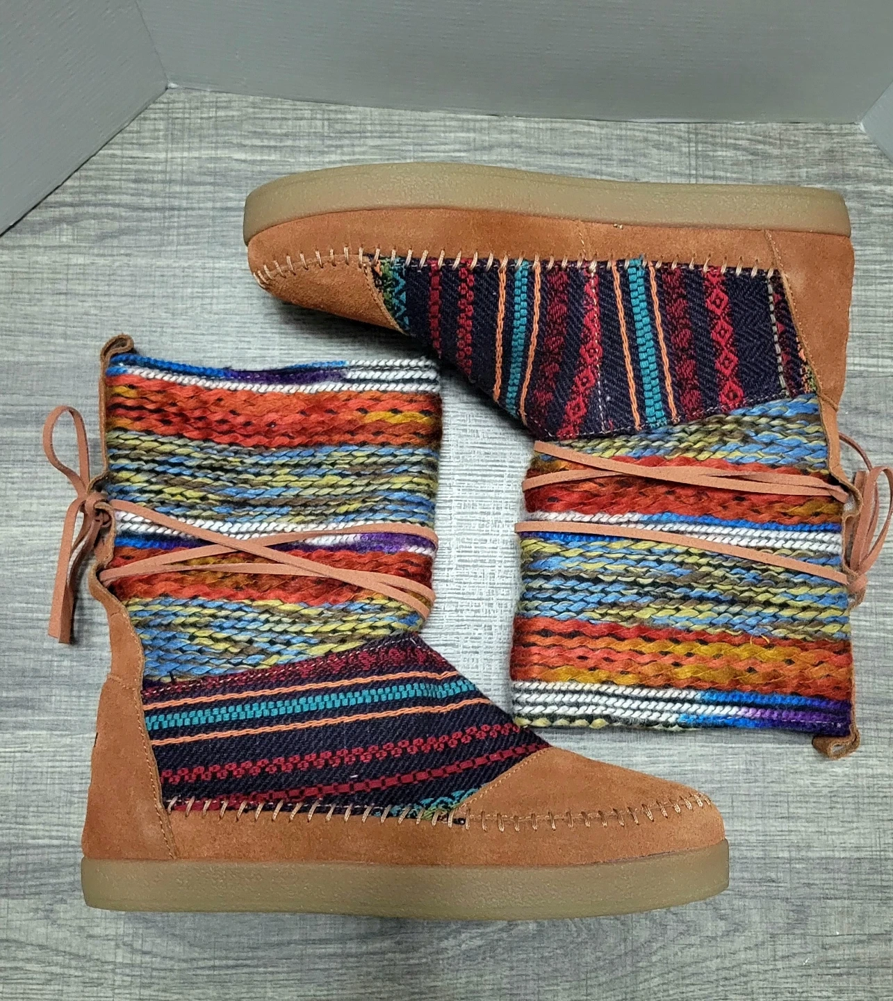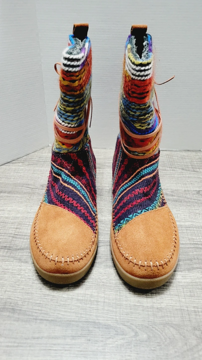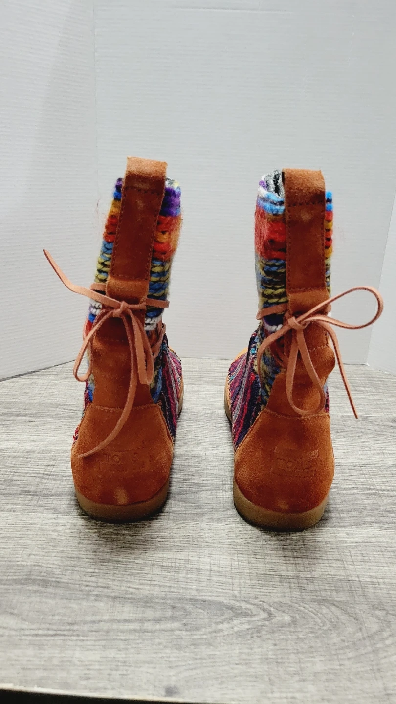 These TOMS Avalon booties feature a colorful woven fabric shaft with suede accents. They come in a size 7.5 and include the original box. Perfect for adding a pop of color to your fall and winter outfits!