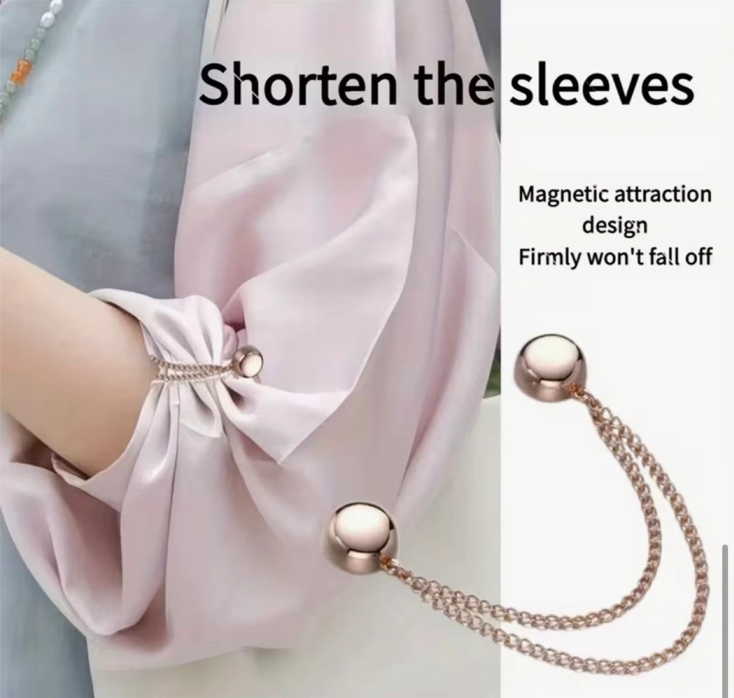 This is a magnetic clip with a double chain. It's designed to help shorten sleeves or cinch pant legs. Strong magnetic adsorption ensures it won't fall off!