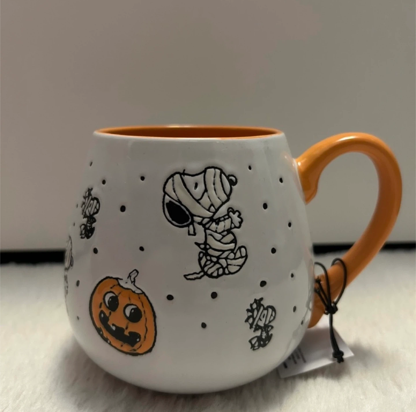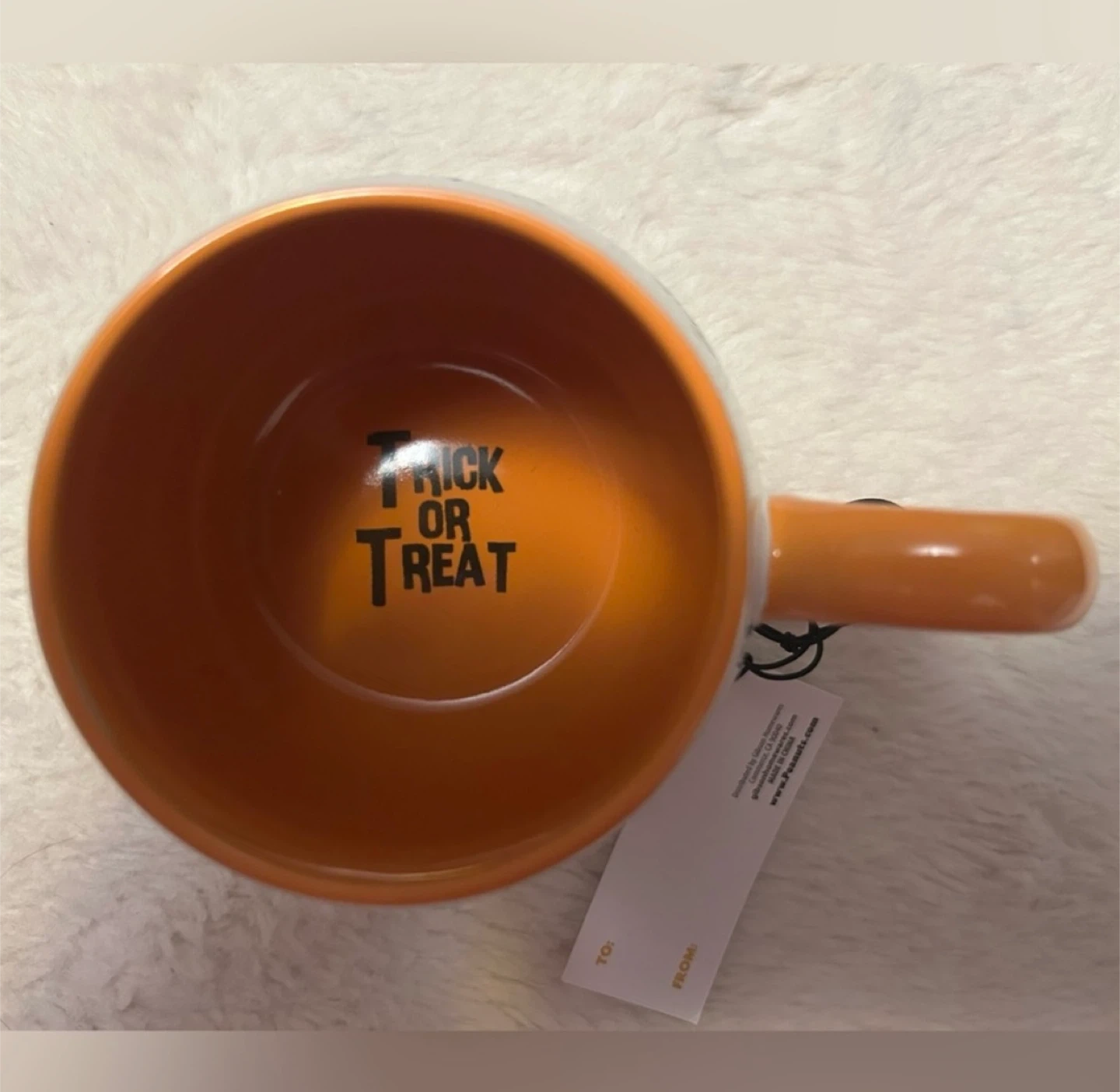 15This is a brand new mug featuring Snoopy dressed as a mummy and a jack-o-lantern for Halloween! It's white with an orange interior and handle, and it says "Trick or Treat" inside