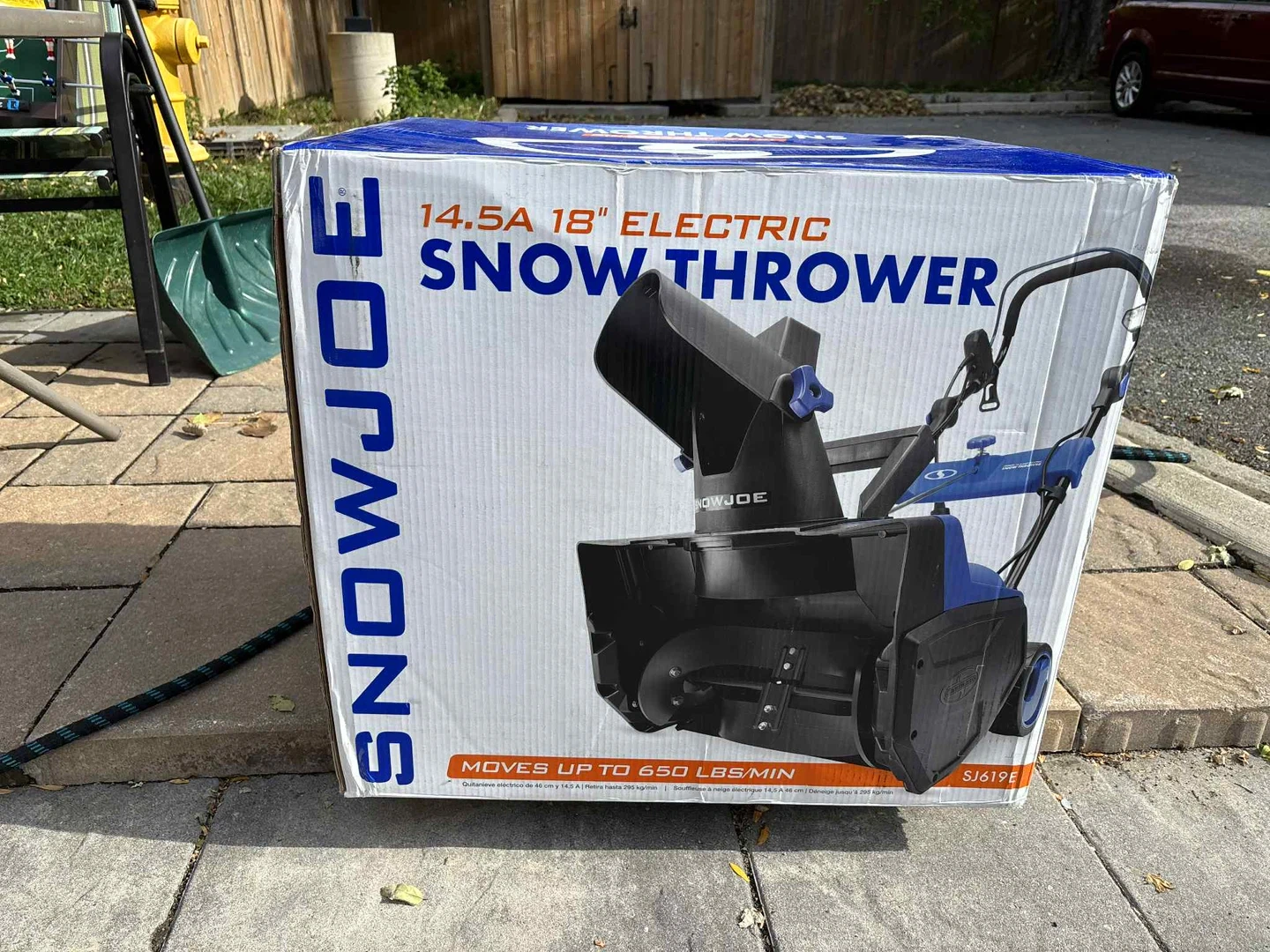 10I'm selling a brand new Snow Joe 14.5A 18" Electric Snow Thrower, model SJ619E! It's still in the box and ready to clear your driveway this winter. This snow thrower moves up to 650 lbs/min and is ideal for mid-sized driveways and walkways. It has a 3 W LED light for safe nighttime clearing. The box is included!