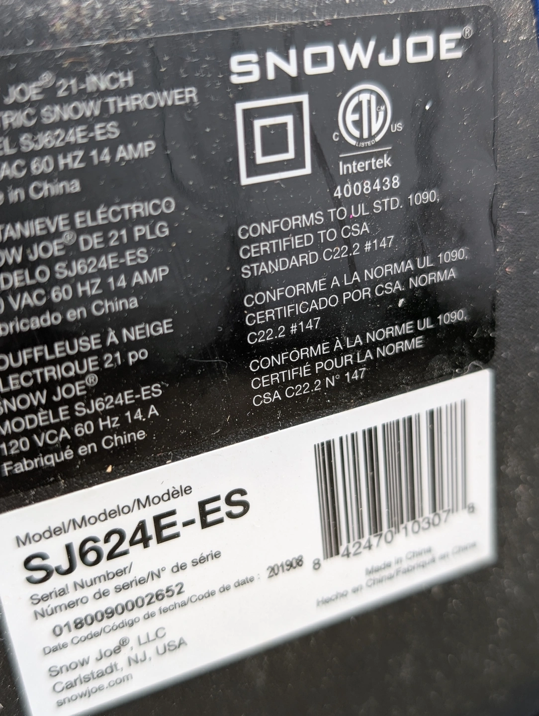 19Selling my Snow Joe SJ624E-ES Electric Snow Thrower/Blower in excellent condition. Bought it new and only used it for few times and it’s been great, works perfectly, and selling now because I am moving and won’t need it anymore. Ideal for clearing snow off large driveways and walkways No gas, oil or tune-ups make it effortless to start and maintain Powerful 14-amp motor moves up to 770 lbs of snow per minute - 23 tons per hour Cuts a path 21 in. wide by 12 in. deep with each pass 180° hand adjustable chute throws snow up to 20 ft away Compact wheels for easy maneuverability