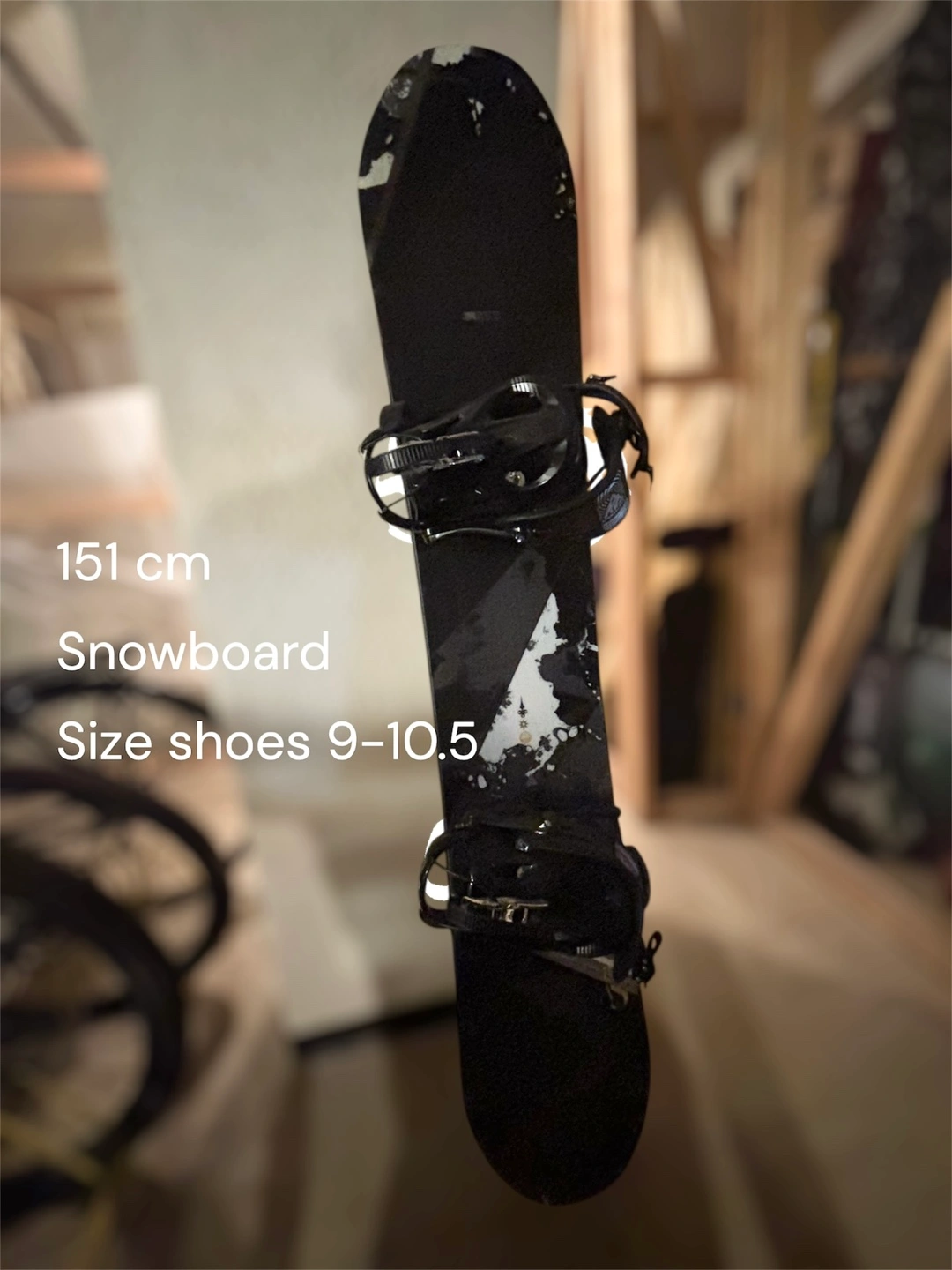 Selling a snowboard that's 151cm in length. It's suitable for shoe sizes 9 to 10.5. It's in great shape and ready for the slopes!