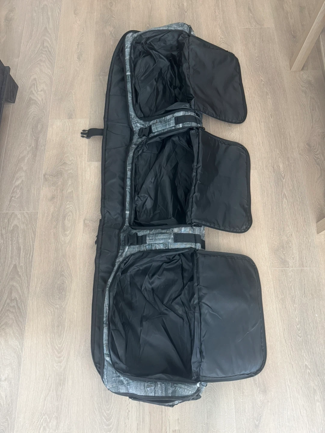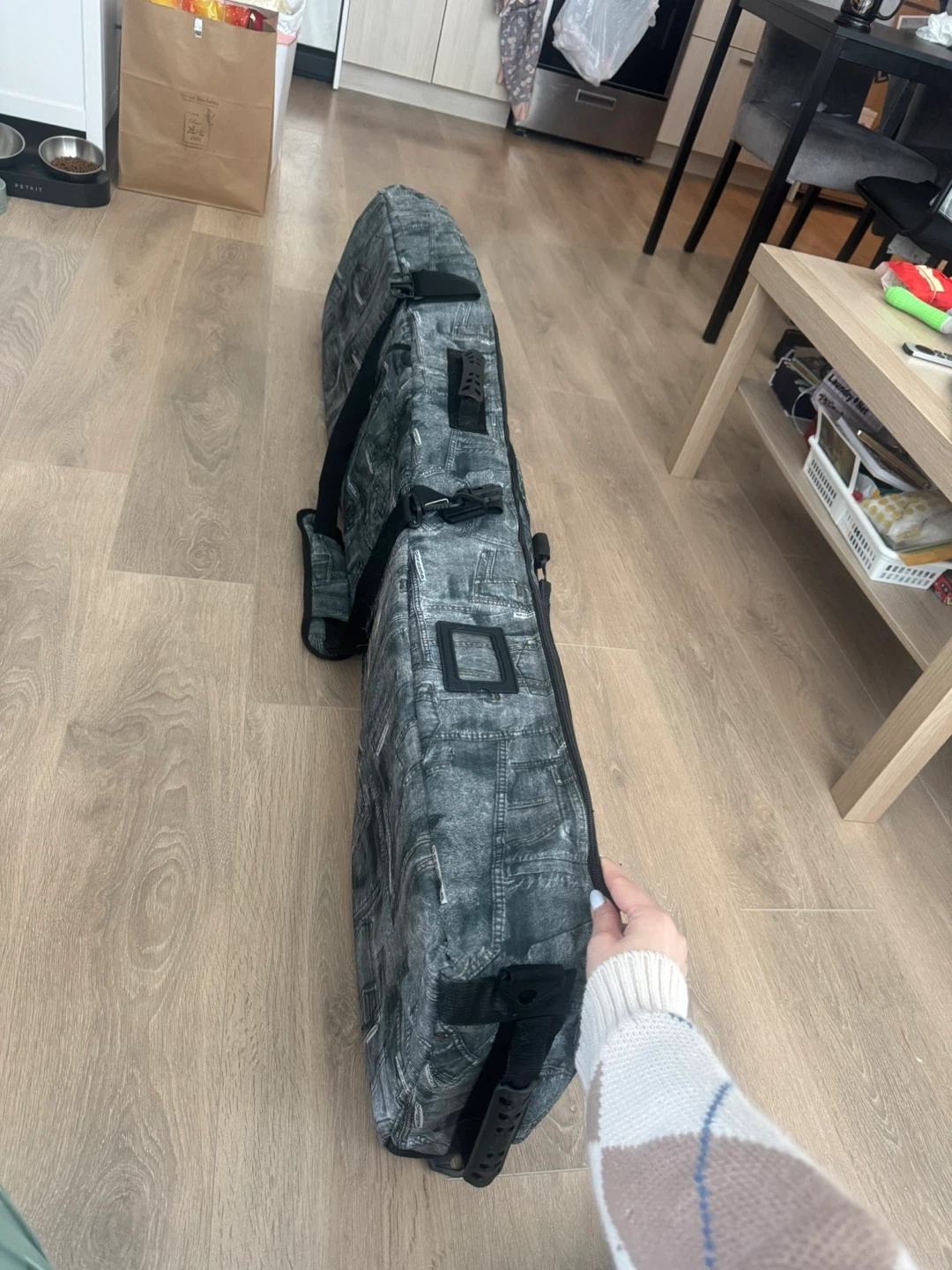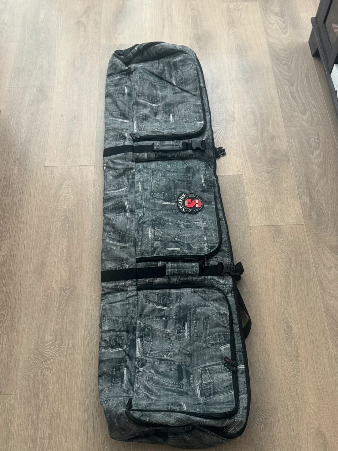Dakine padded roller snowboard bag in a denim-like grey pattern. It has multiple compartments and straps to keep your board and gear secure. Perfect for travel!