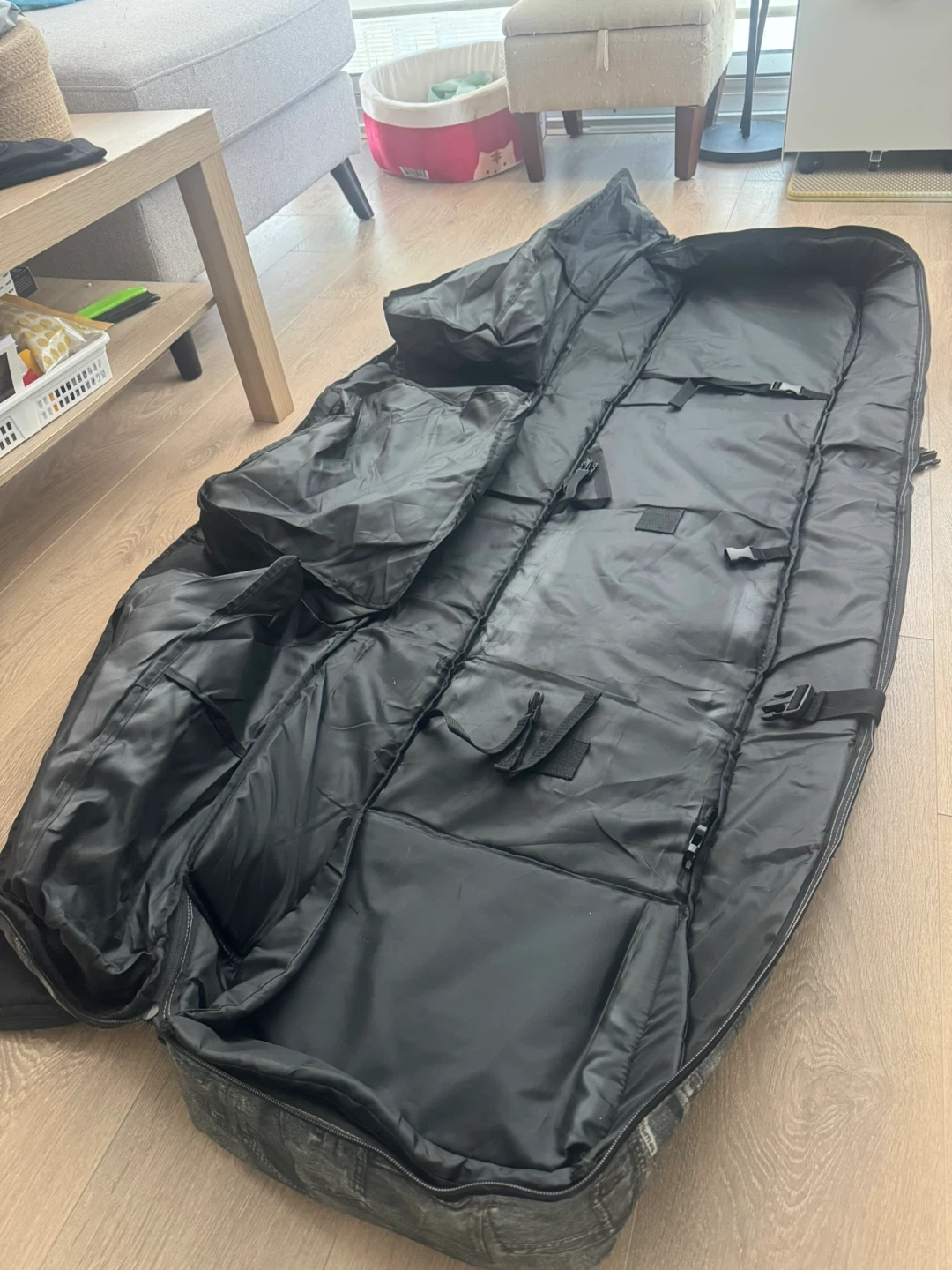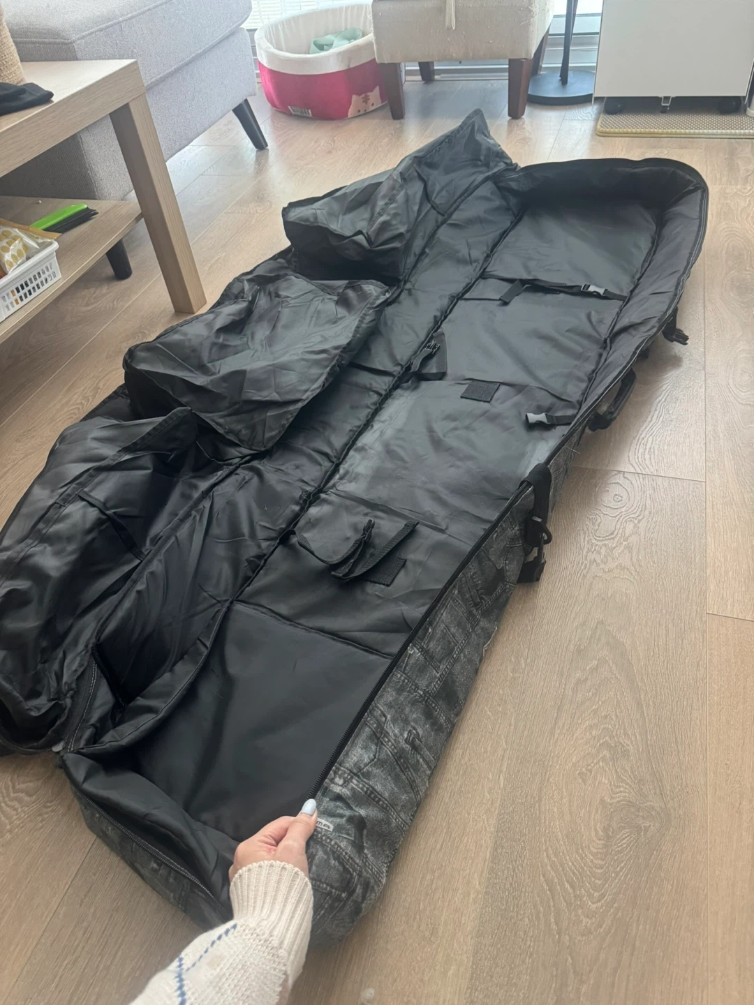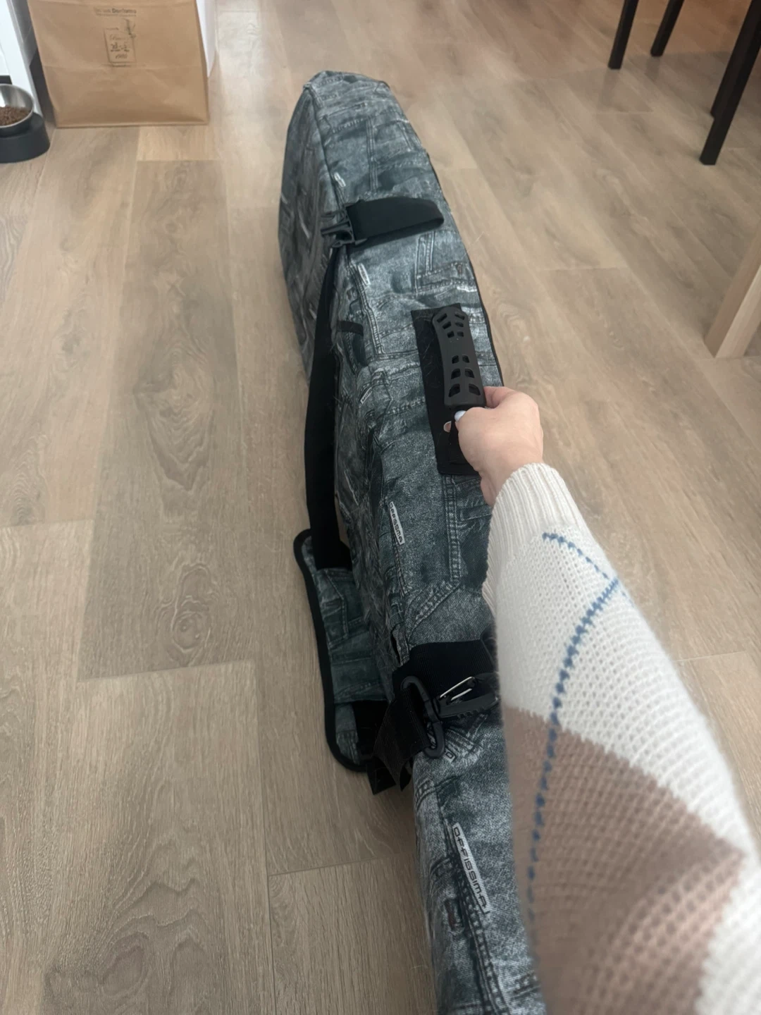 Dakine padded roller snowboard bag in a denim-like grey pattern. It has multiple compartments and straps to keep your board and gear secure. Perfect for travel!
