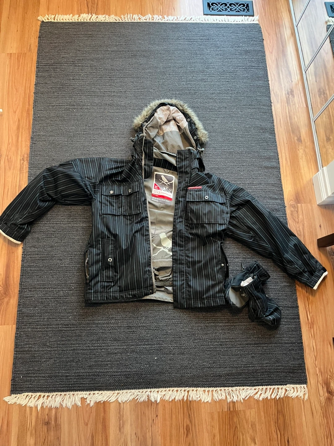 10Beautiful Four Square men’s small snowboarding jacket with detachable hood and matching mitts.