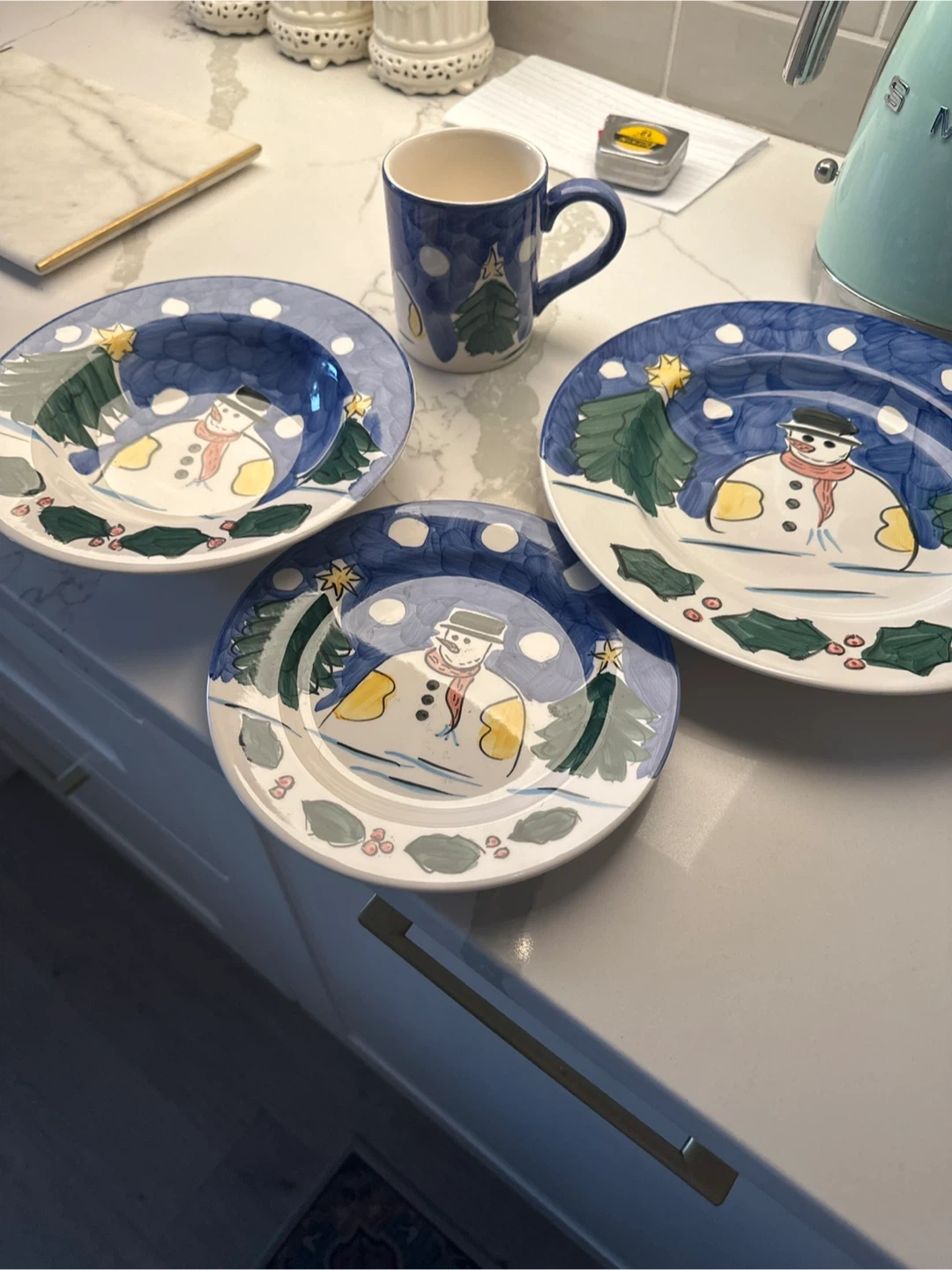 Selling a cute set of Christmas-themed plates and a mug! They feature a snowman and Christmas tree design with a blue and white colour scheme. Perfect for adding a festive touch to your holiday meals!