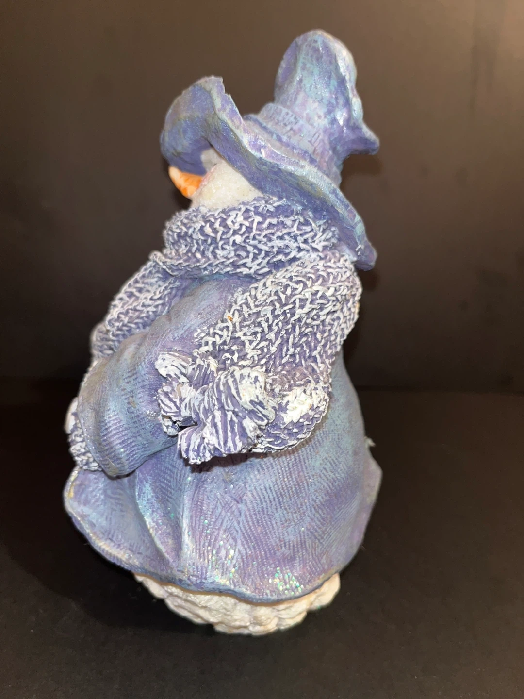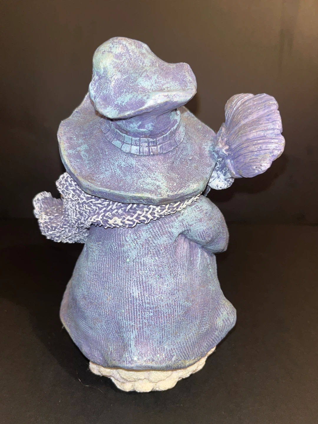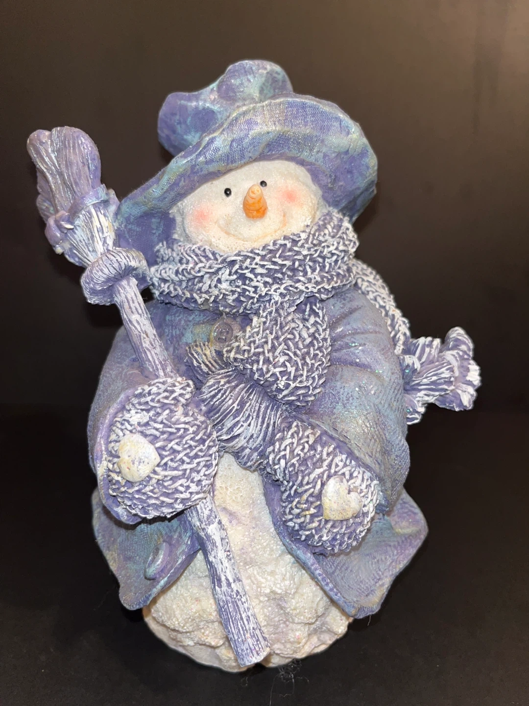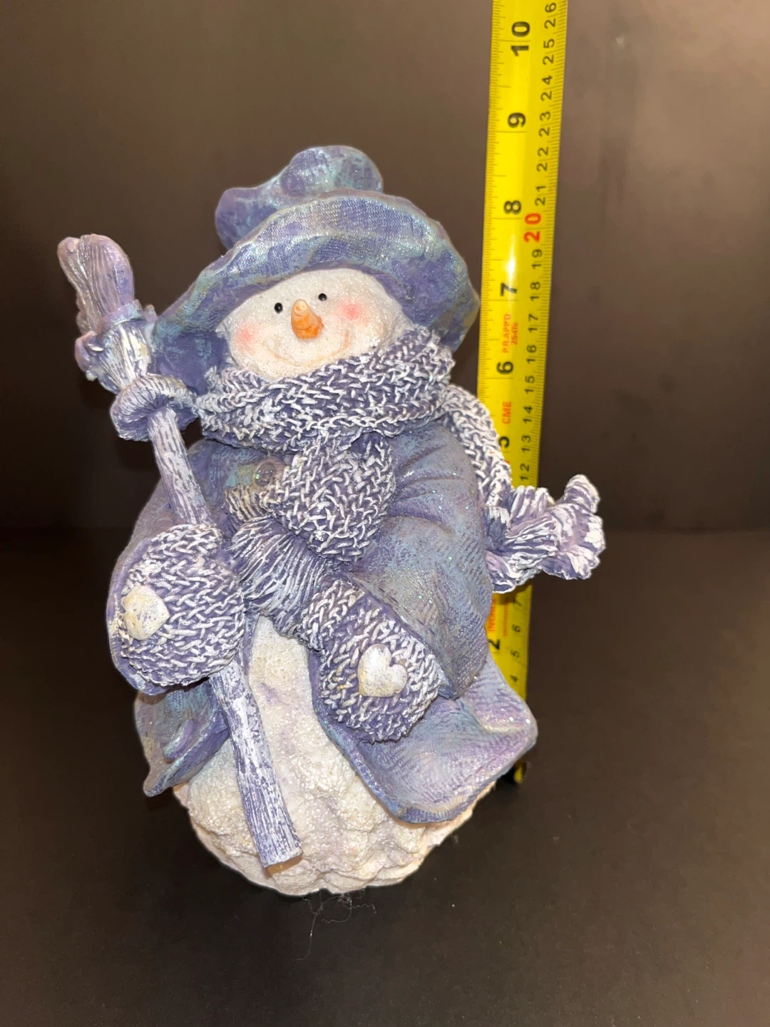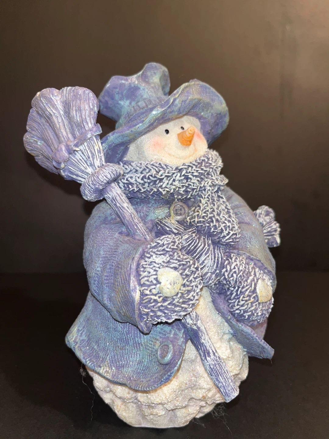 76This adorable snowman figurine is ready to bring some winter charm to your home! It's dressed in a lovely blue coat and hat with a matching scarf, and he's holding a broom. The base is white, giving the illusion that he is standing on snow. Perfect for adding a touch of whimsy to any room!