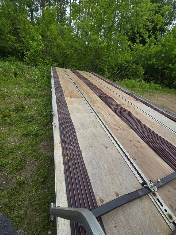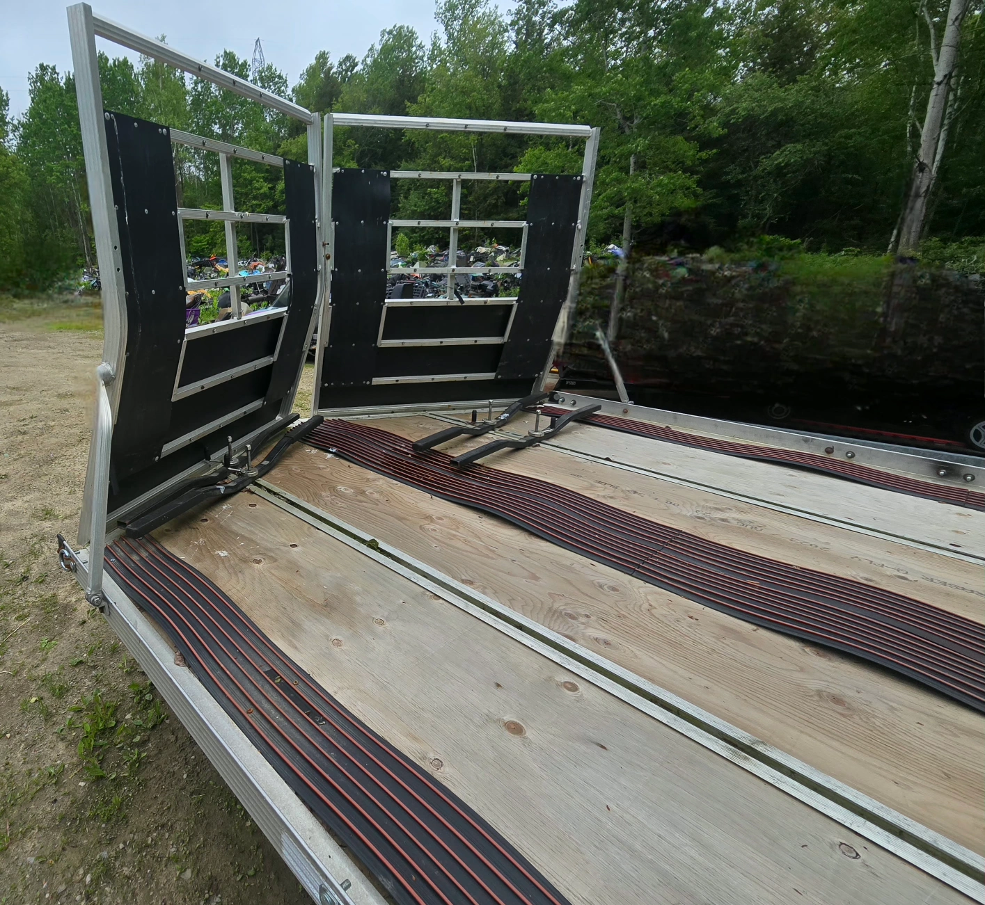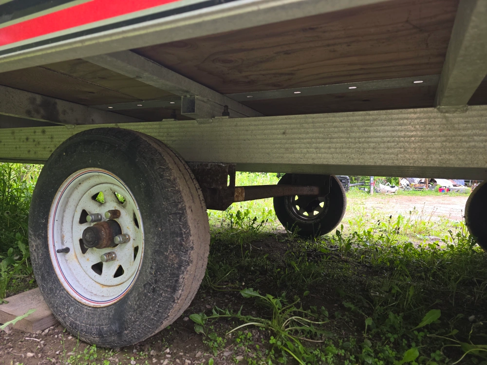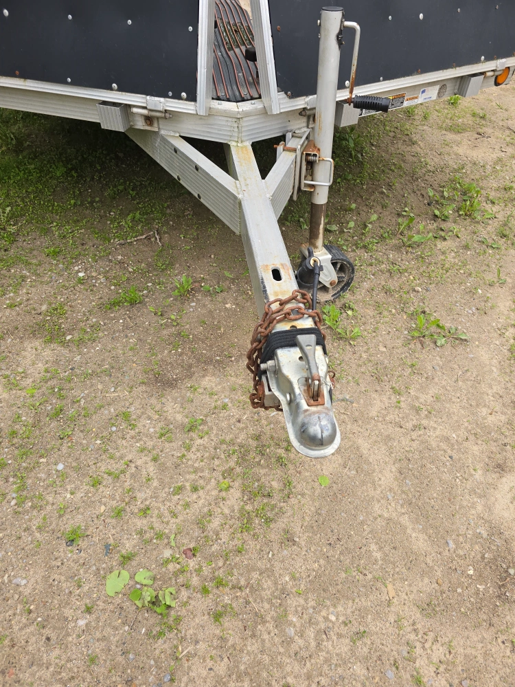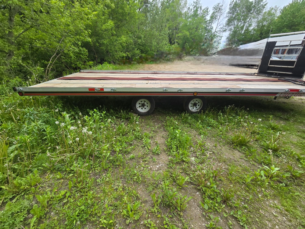 102012 Triton Trailer 24 ' . Dual- torsion axles . Can hold 4 long track sleds . It can hold 6 ATV's . It has 4 adjustable locking bars on the tailer deck . Just installed all brand new pressure treated plywood deck and new snowmobile runners for the ski's. It has all tiedown hooks on both sides . It has a built-in removable portable ramp at the back. Easy loading on the back and easy drive off the front . Front ramps act as a snow guard . All Aluminum Tailer easy to haul . Tires & wiring are good . There are no issues with this tailer . Comes with ownership and a spare tire . Serious inquiries only.