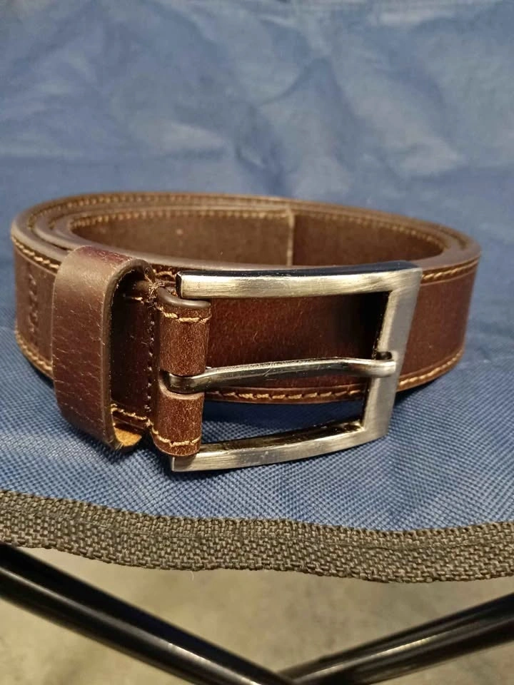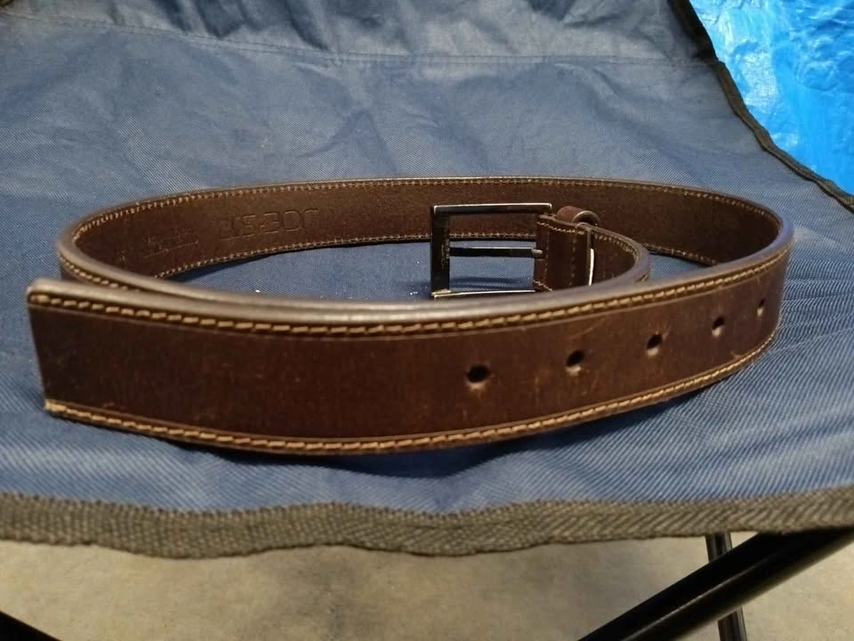 Durable brown genuine leather belt from Joe's Jeans. This is a size 36 and was made in India. It has a brushed silver-tone metal buckle and tonal stitching along the edges.