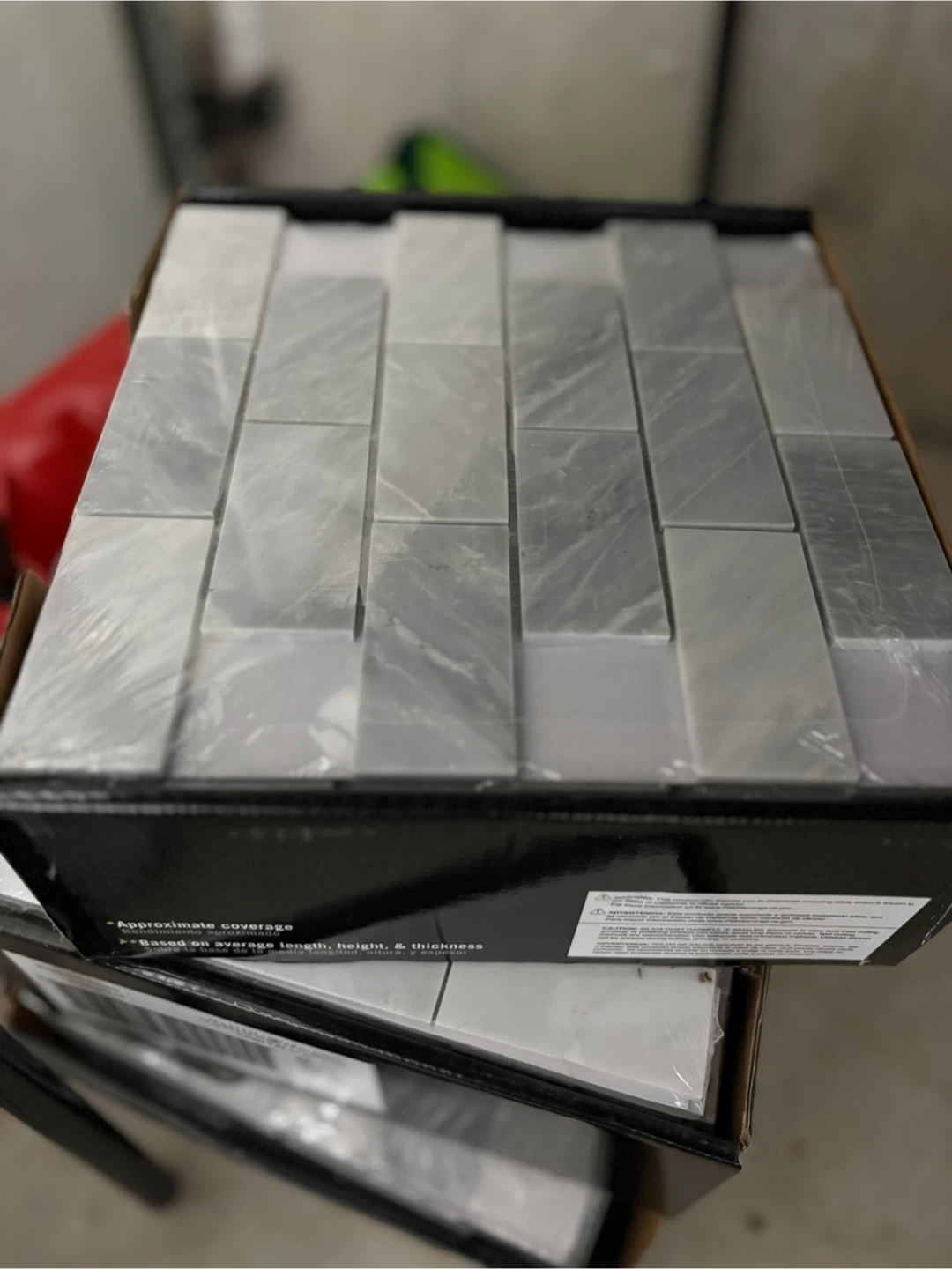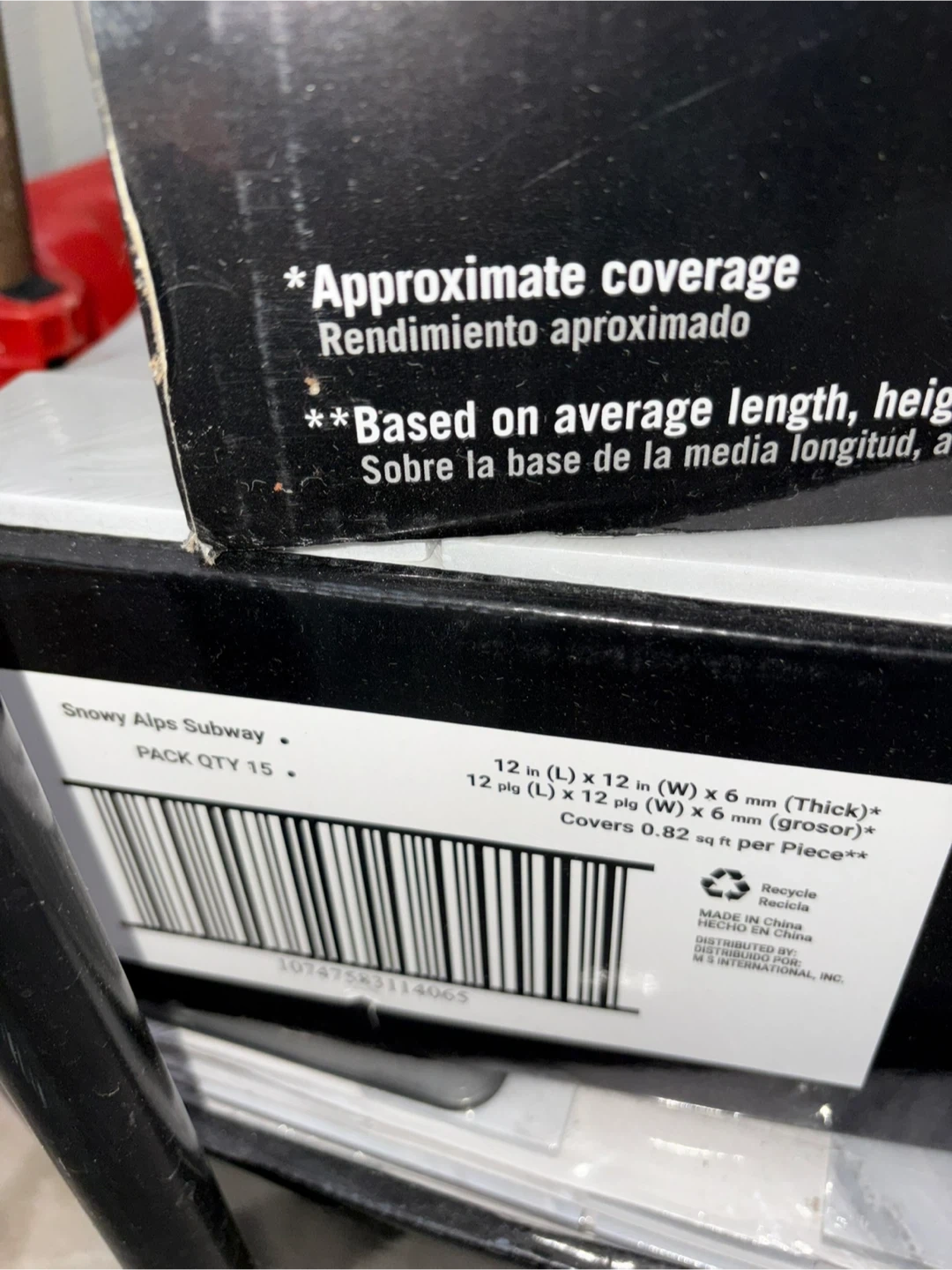 3 packs of 15 Snowy Alps Subway stone tiles. Each tile measures 12 in x 12 in x 6 mm thick. They cover 0.82 sq ft per piece. They're suitable for various home improvement projects. Great for backsplash.