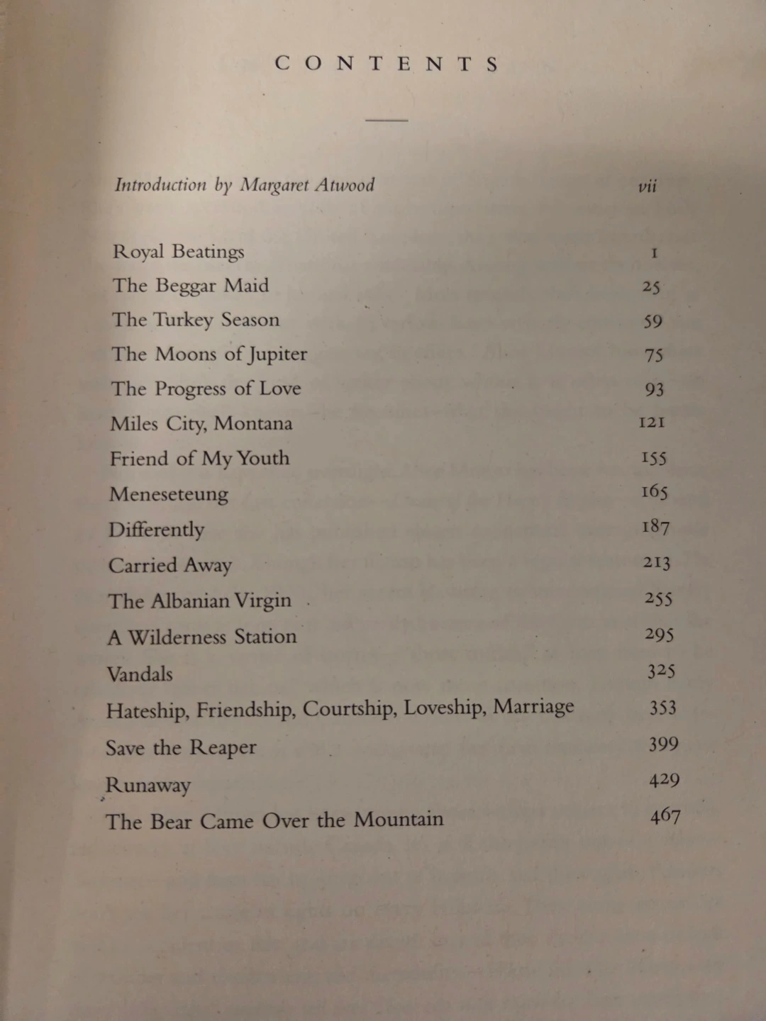 This is a collection of selected stories by Alice Munro, with an introduction by Margaret Atwood. It's published by McClelland & Stewart and Douglas Gibson Books. The book includes stories like "Royal Beatings" and "Runaway."