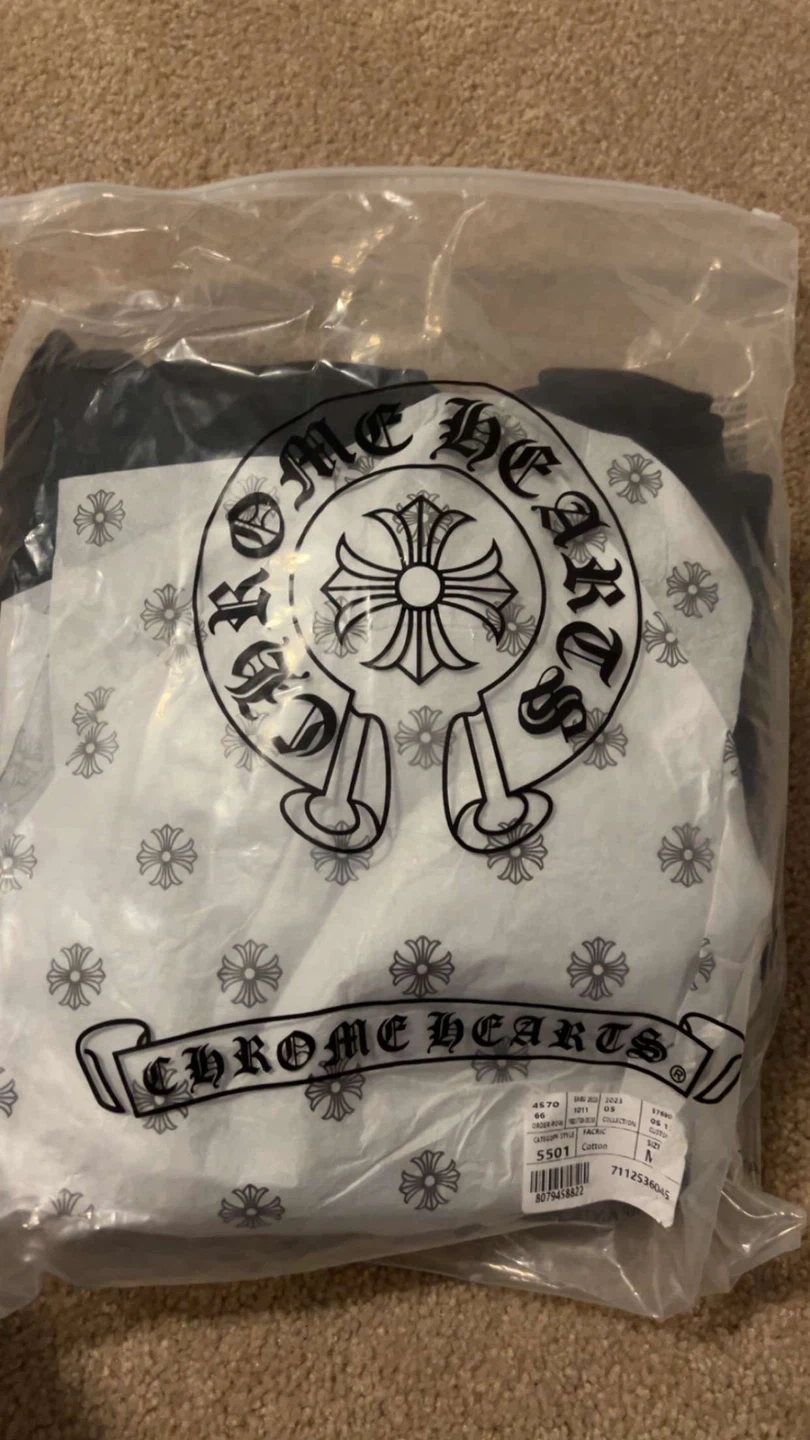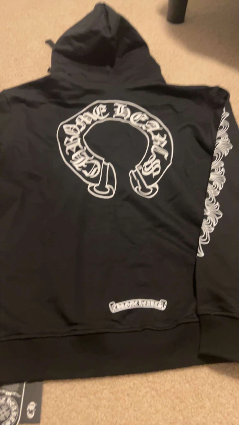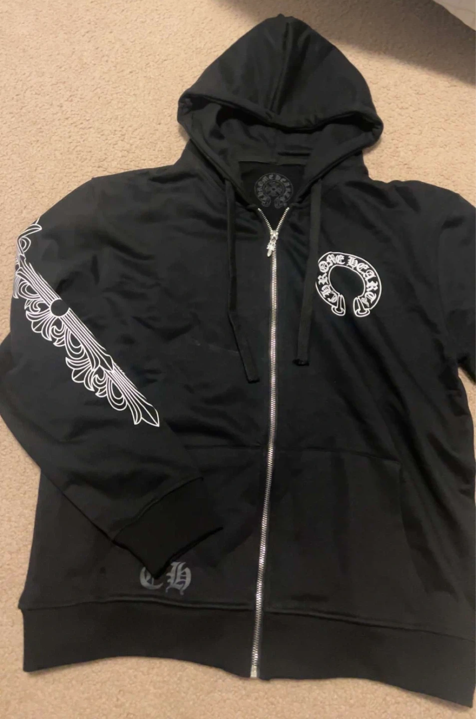 This is a 1 of 1 black Chrome Hearts zip-up hoodie. It's a size medium and features the iconic Chrome Hearts logo on the front and back. The hoodie is still in its original packaging.