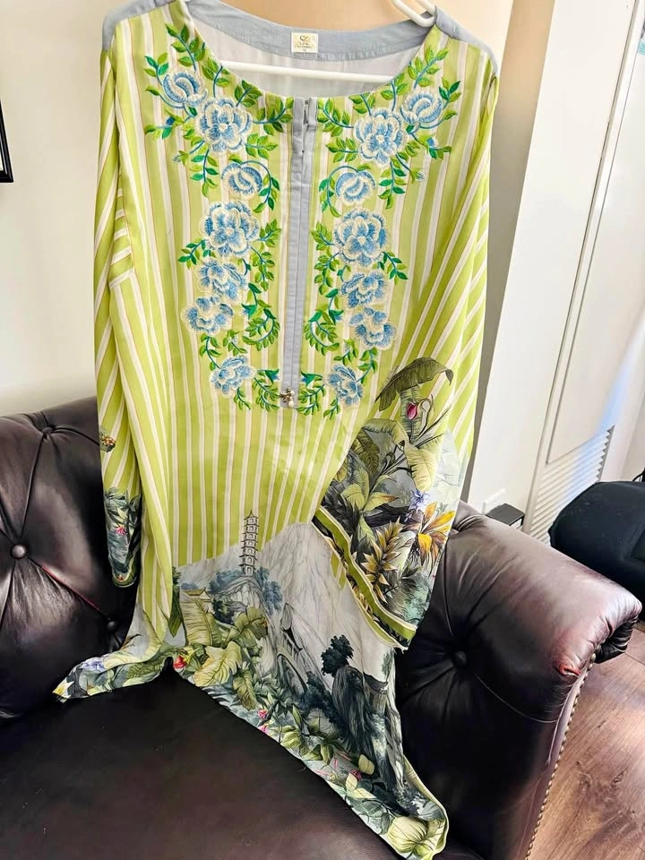 Brand: So Kamal, material georgette, size medium but itβs a loose fit (chest 22), shirt only, embroided front