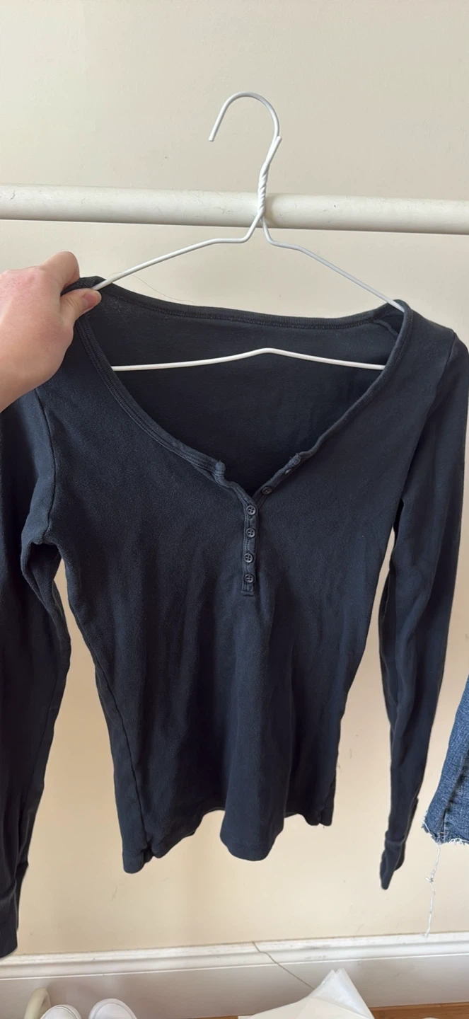 Black long-sleeve henley shirt with a V-neck and button-up detail. It's made from a soft cotton blend for comfort. This top is a great layering piece for cooler weather.