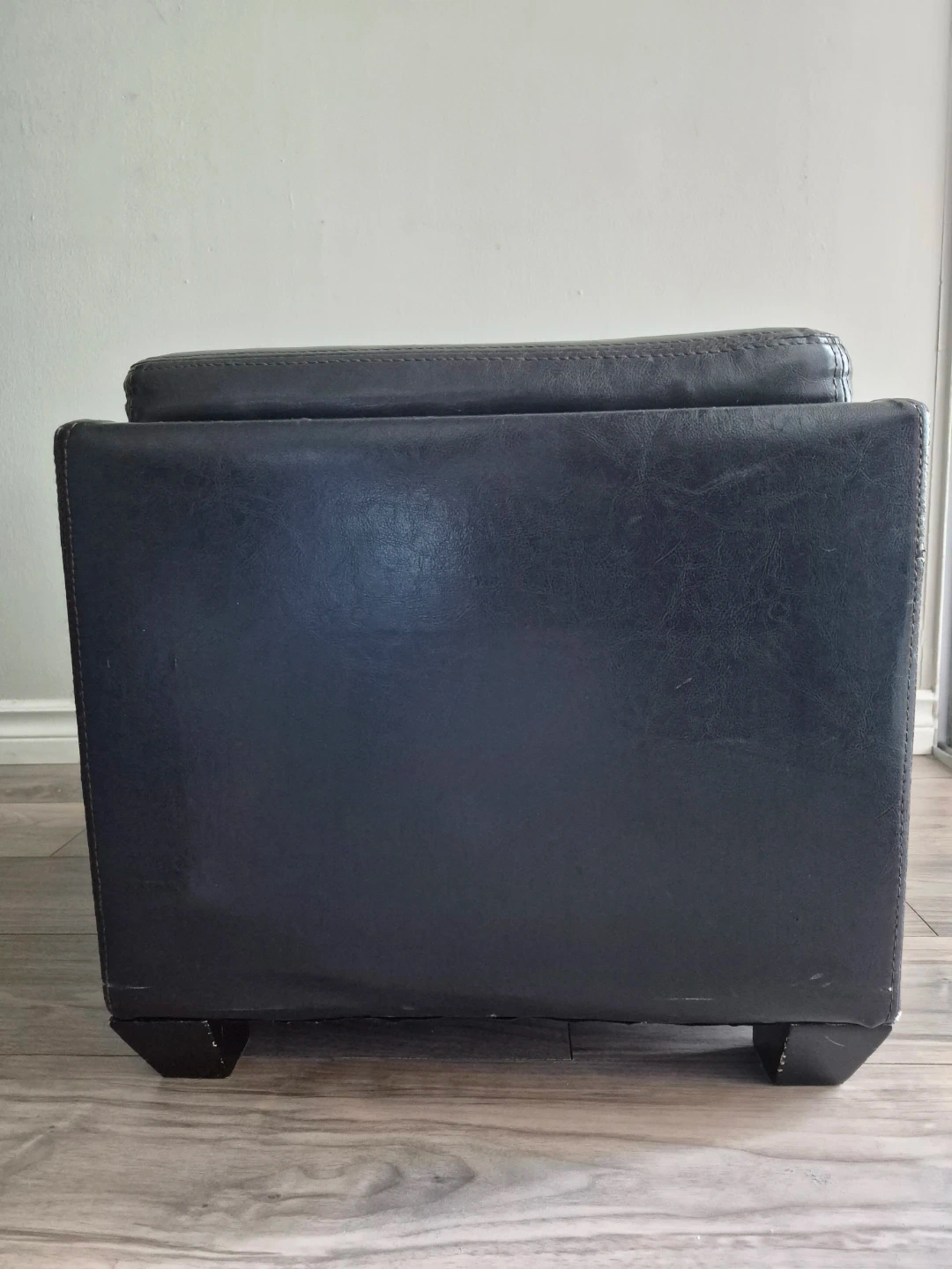 This is a black storage ottoman with a faux leather exterior. It's great for extra seating or to keep your space tidy. The lid lifts for convenient storage inside. Perfect for a living room or bedroom!