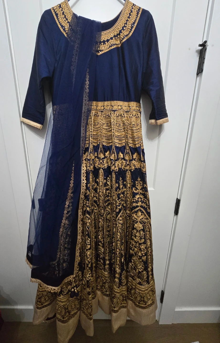 Beautiful blue and gold Anarkali dress, perfect for a special occasion! The intricate gold detailing really makes it stand out. It's in great condition and ready for a new home in your closet!
