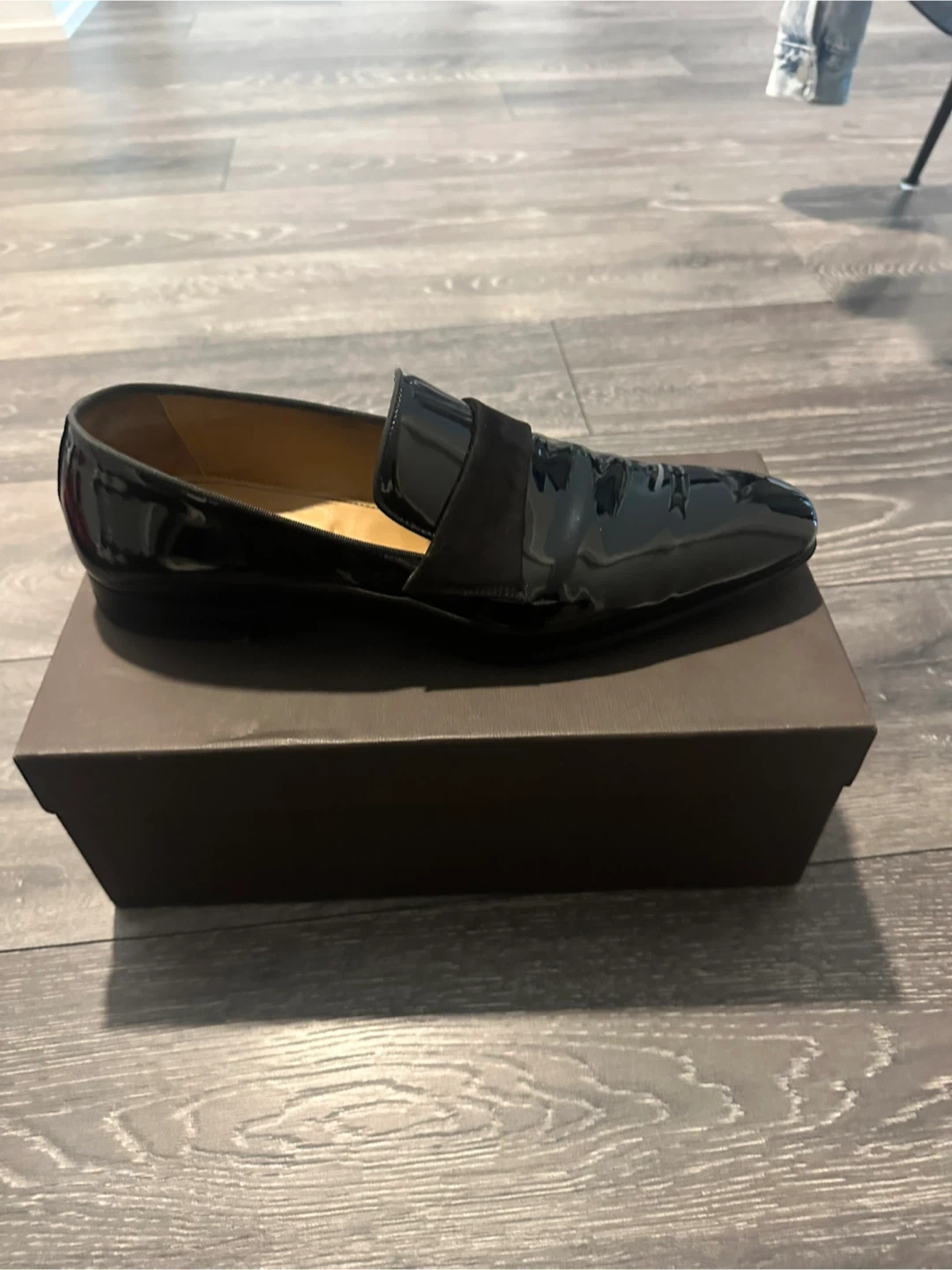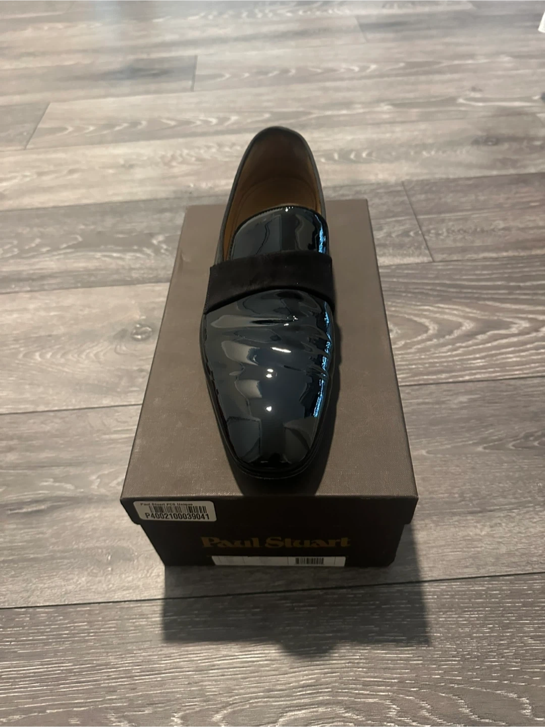 Paul Stuart patent leather loafers. Includes original box and dust bags. Classic black color.