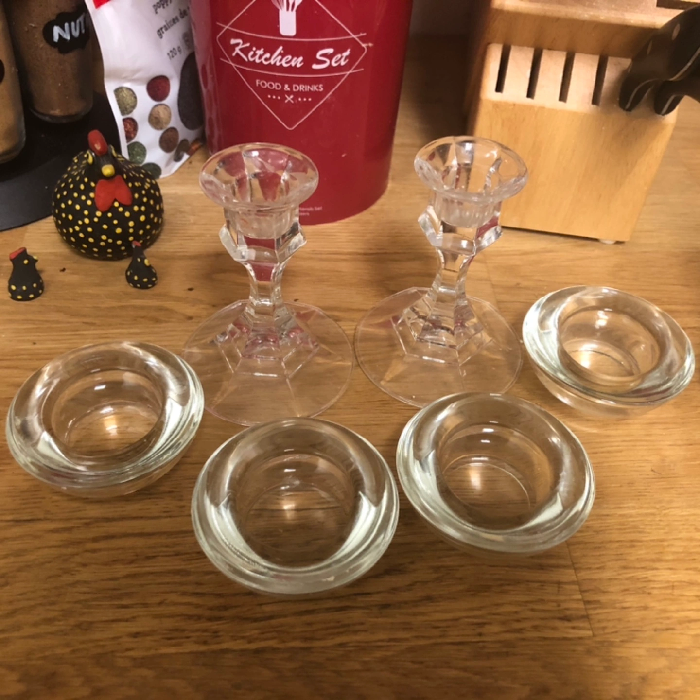 Set of 6 glass candle holders. Two tall holders with wide bases and four smaller round holders.