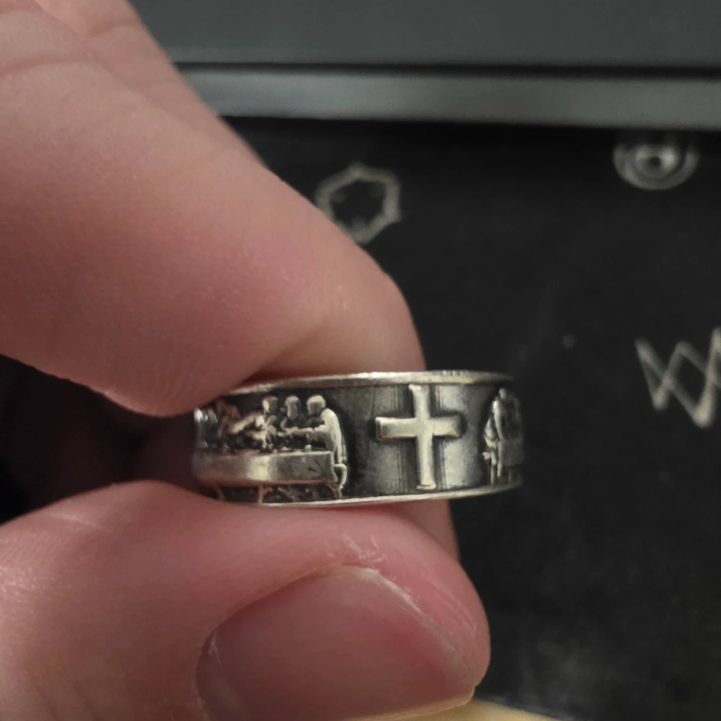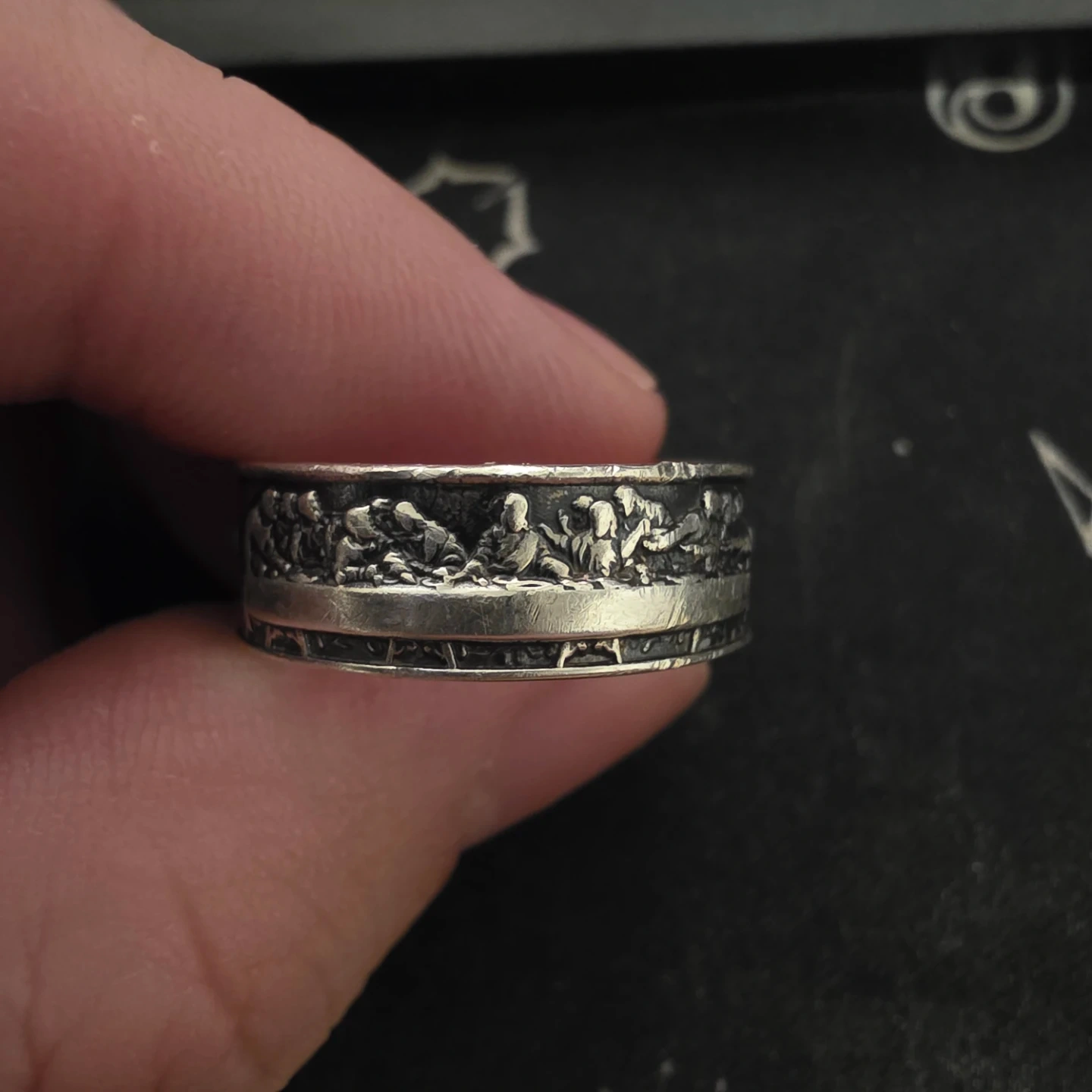 A unique silver-tone ring featuring intricate depictions of the Last Supper and a prominent cross. This ring showcases detailed religious artistry around its band. It's a meaningful piece for personal wear or gifting.