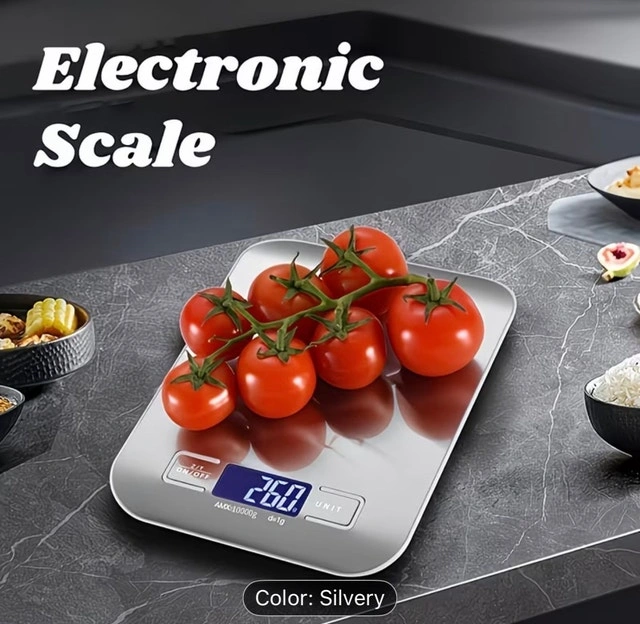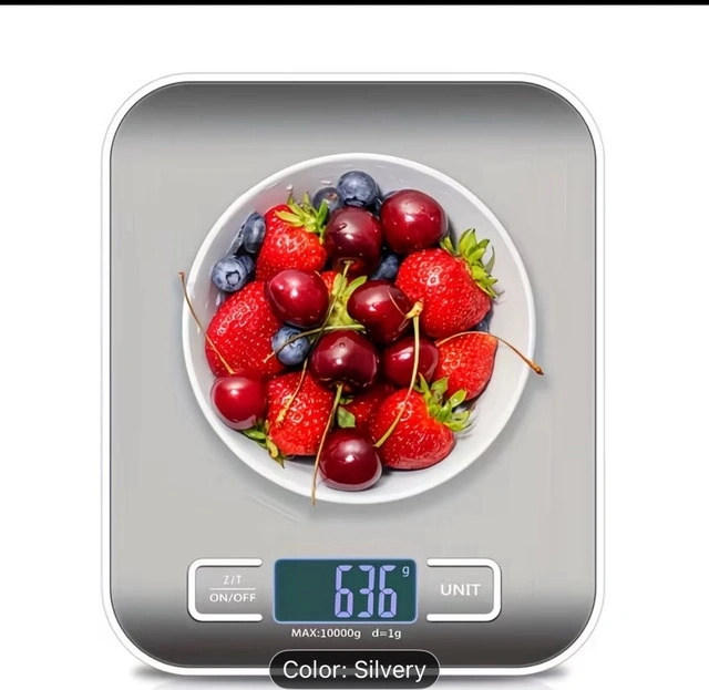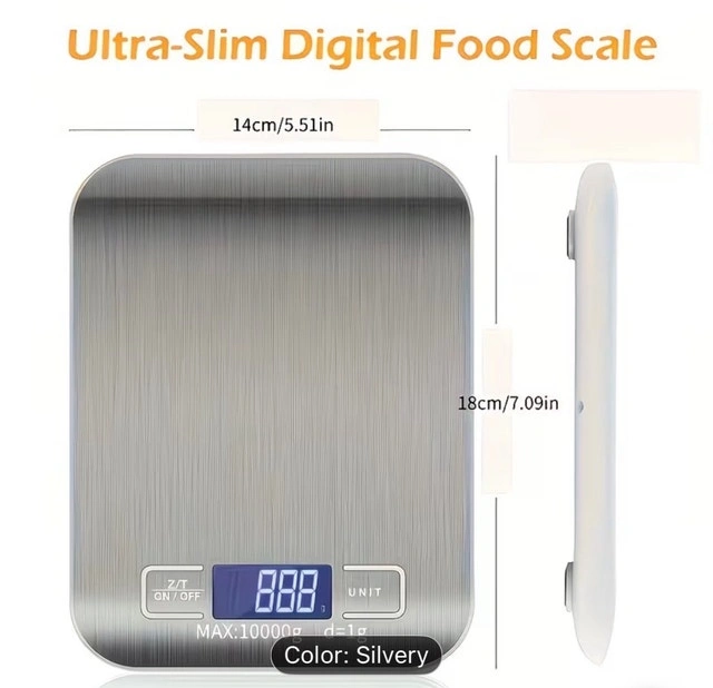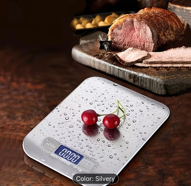 Measure ingredients with precision using this digital kitchen scale, capable of weighing up to 10kg with 1g accuracy, and featuring a sleek silver finish! This kitchen scale is in very good condition and ready for your culinary adventures. Its slim design allows for easy storage, and the clear LCD screen ensures easy reading. Key features: Maximum weight capacity: 10kg, Accuracy: 1g, Material: Stainless steel, Display: LCD, Units: g, oz, lb, ml. Feel free to message if you have any questions!