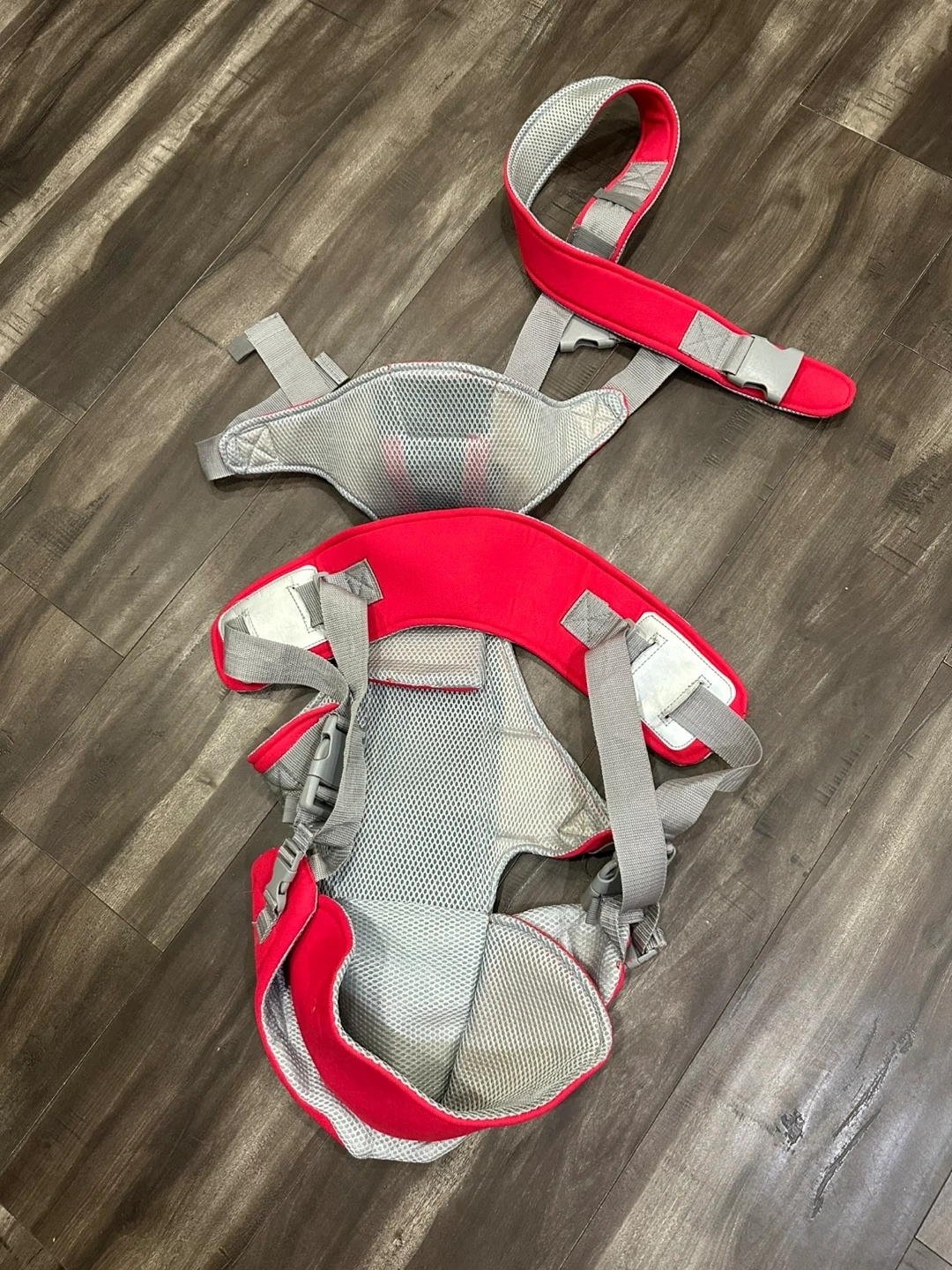 This is a red baby carrier with grey mesh accents. It includes adjustable straps for a comfortable fit. It's designed for carrying infants.