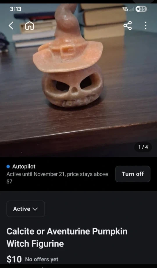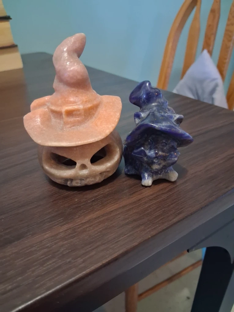 Selling two adorable crystal carvings! One is a sodalite cat wearing a witch hat, and the other is a calcite or aventurine pumpkin witch figurine. Perfect for adding a touch of whimsy to your decor! This pumpkin piece is hallow so if you have a light to put under it, it looks pretty spooky. Check the pictures to see with light.