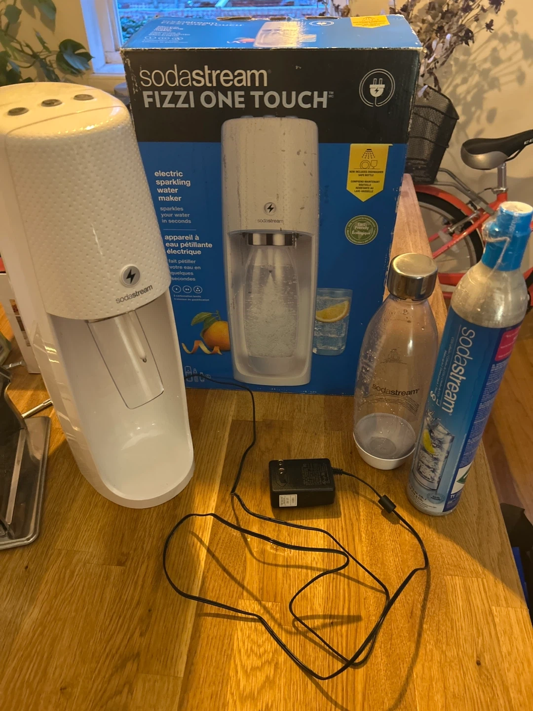 I'm selling a SodaStream Fizzi One Touch! It's an electric sparkling water maker that sparkles your water in seconds. The box is included, along with the power adapter, bottle, and 1 full + 0.75 CO2 canister, the canisters alone are $40 dollars, and you can trade the empty one for $20