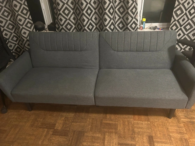 60This stylish grey futon is perfect for small spaces, offering both seating and a comfortable sleeping area for guests. It is in used good condition, has a modern design, and easily converts from a sofa to a bed, making it a versatile addition to any home. The futon has minor signs of wear, but is in great shape! It’s ready to bring comfort and style to your living space. For Sale By: Owner