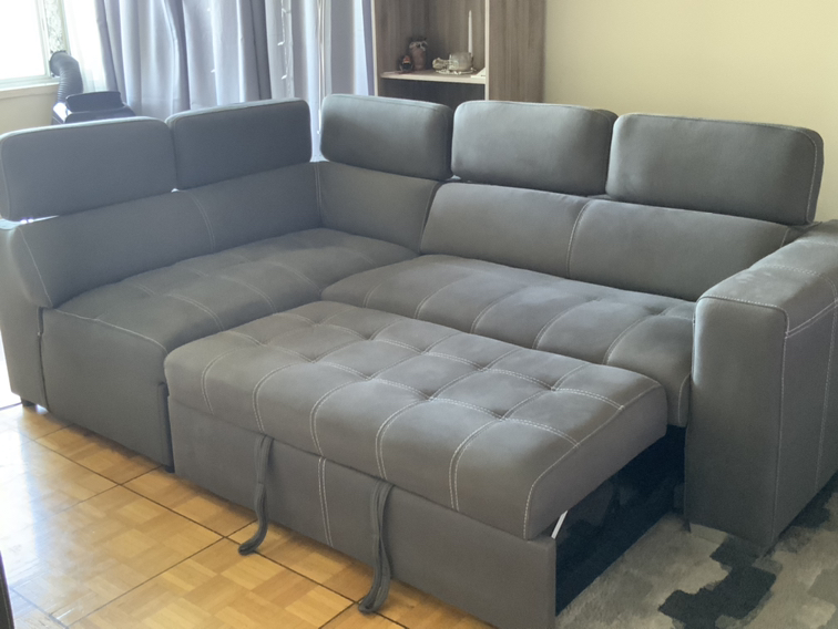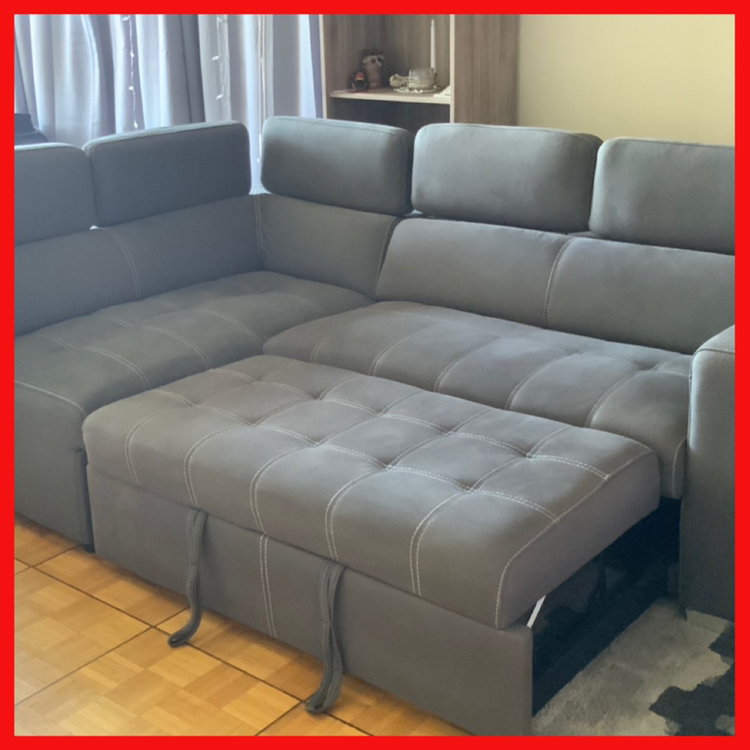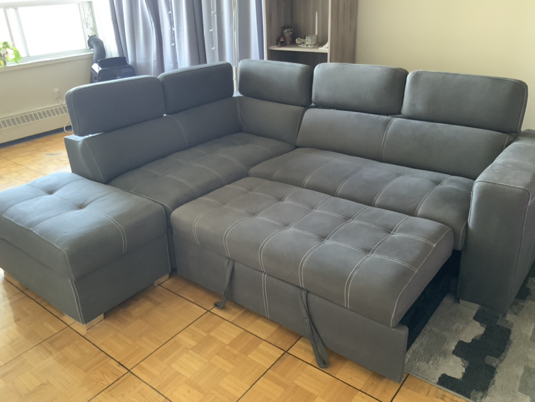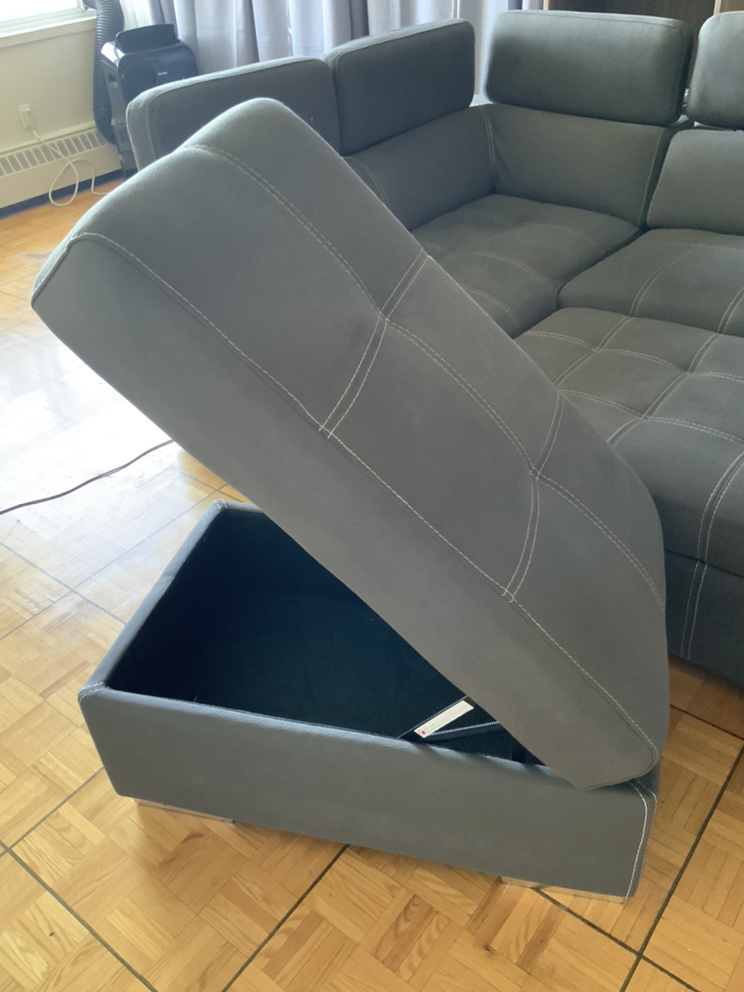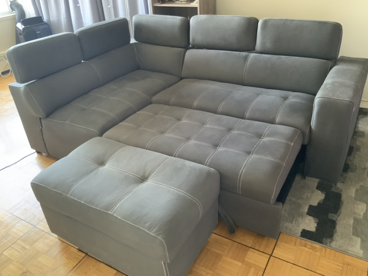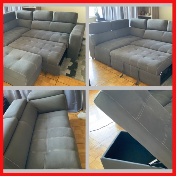 5Brick corner sofa adjustable into bed + storage ottoman with foldable headrest! Sofa bed 63 * 99 * 27 inch Storage Ottoman 39 * 23 inch Pick up, North York. Please text or DM for any details. No calls.