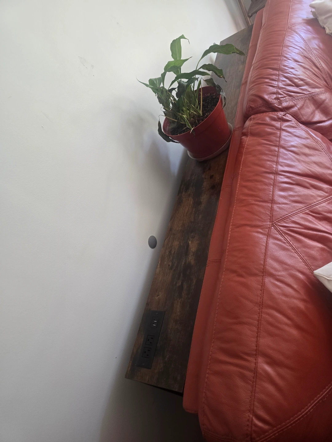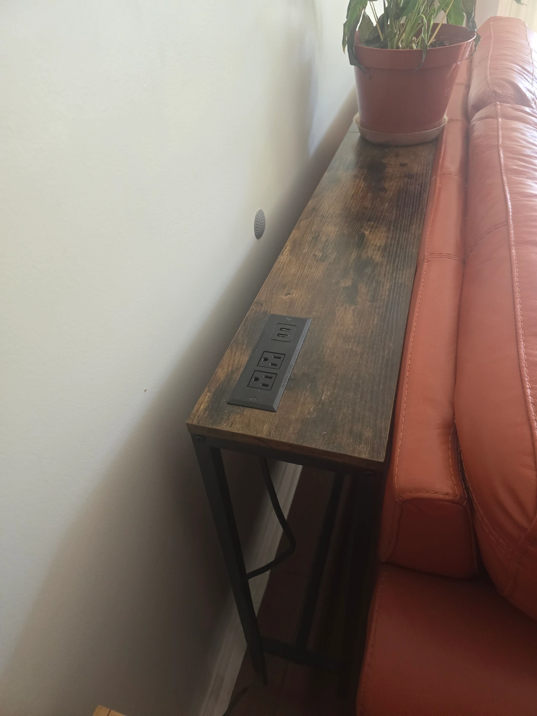 Dark brown wood top with black metal frame. Built-in power outlets for convenient charging. Perfect for behind your couch.