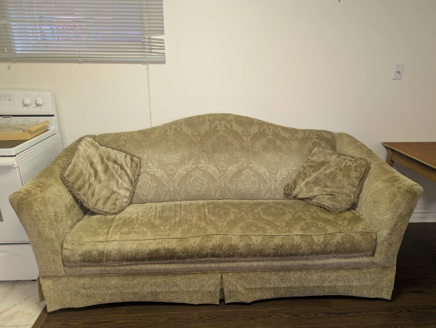 A comfortable sofa with a neutral patterned fabric. It comes with two matching throw pillows. Perfect for a living room or den!
