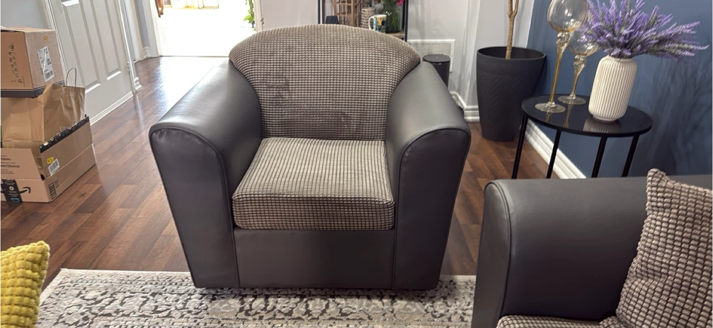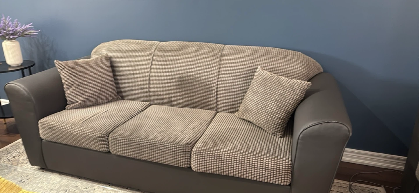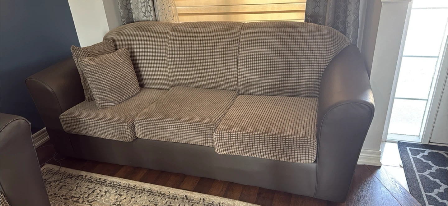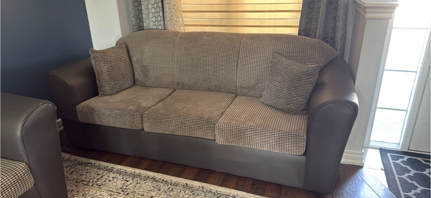 0Selling a comfy loveseat and armchair set! The set features a light and dark grey patterned fabric on the cushions and backrests, complemented by a dark grey faux leather base and armrests. Perfect for a living room or den! The cushions are soft and supportive, making it a great place to relax after a long day.