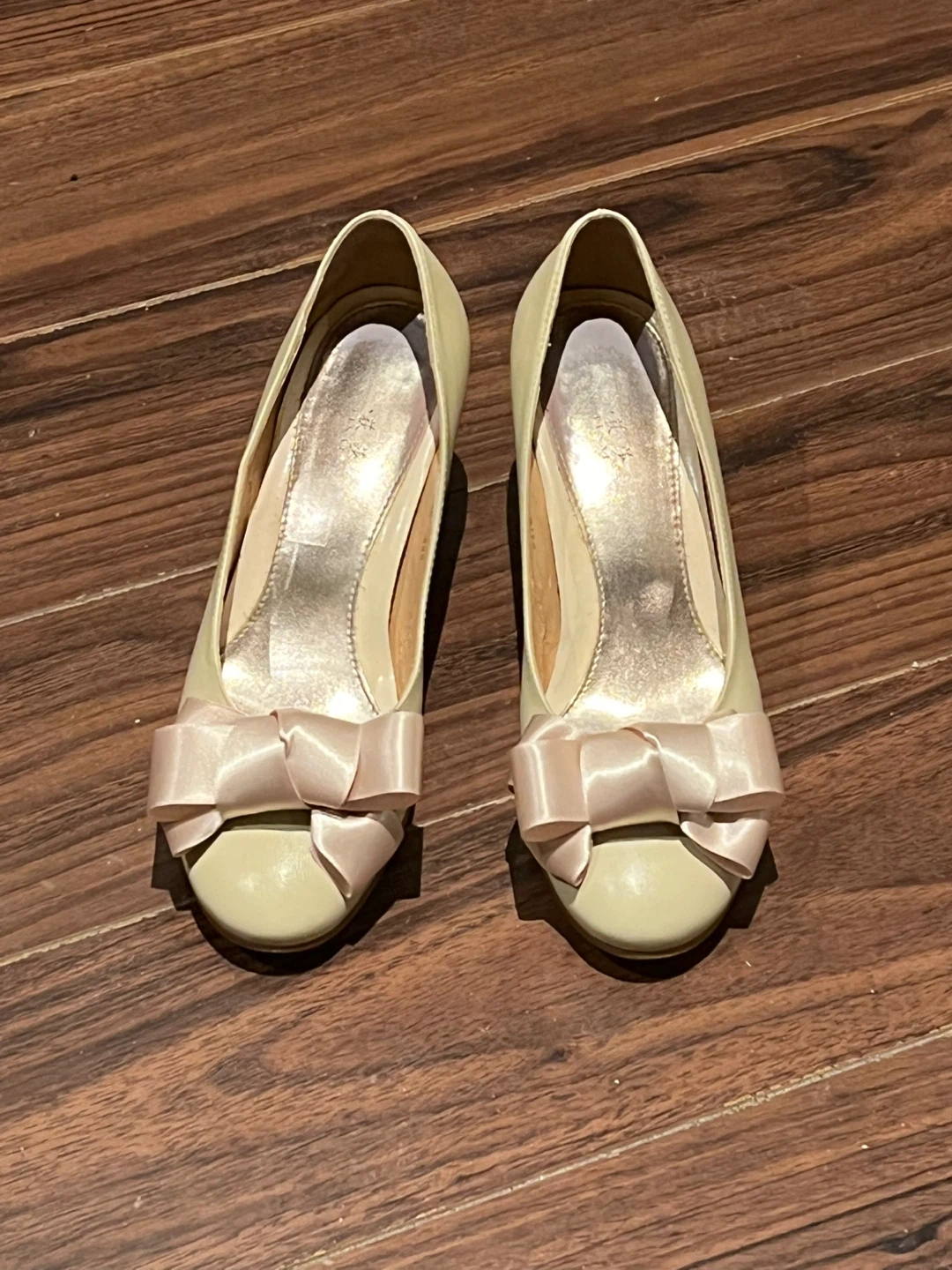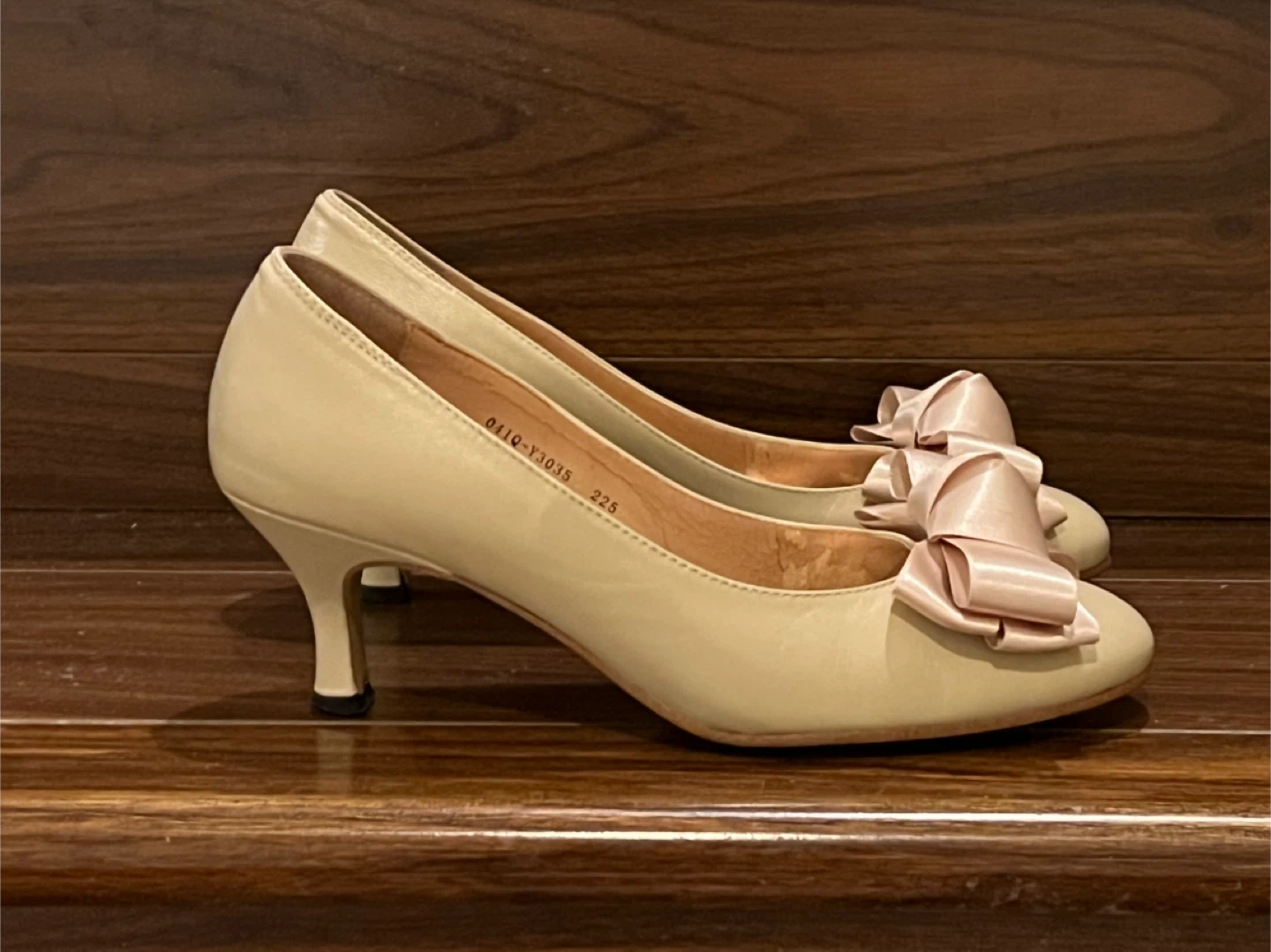Soft Beige Leather Mid-Heels with Bow | Size 35