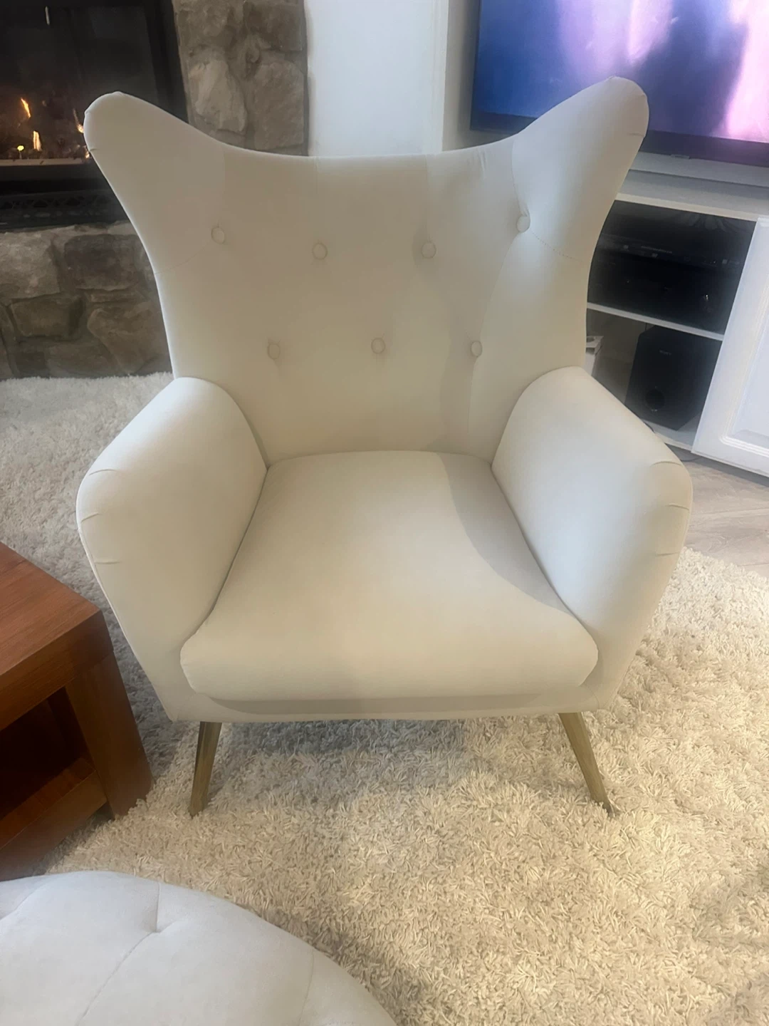 Cream fabric accent chair with button tufting. It has tapered gold legs. Adds a cozy touch to any room!