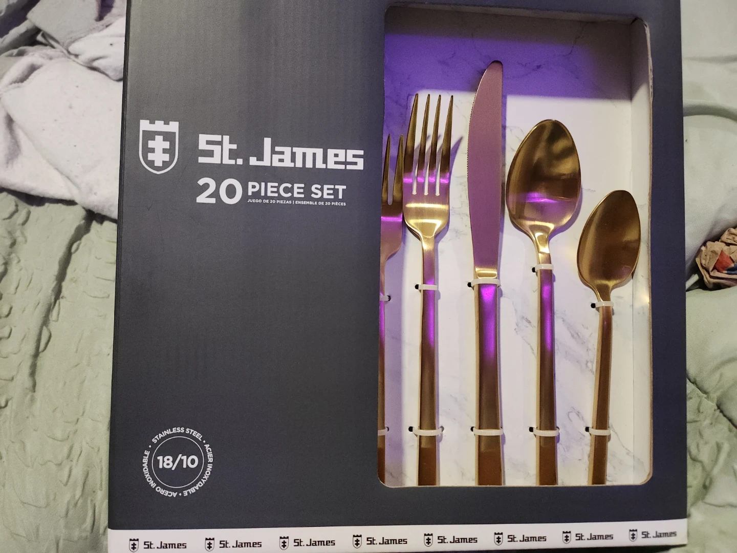 This St. James 20 piece cutlery set is made from 18/10 stainless steel and has a beautiful rose gold finish. It includes forks, knives, and spoons. This set is perfect for everyday use or special occasions!